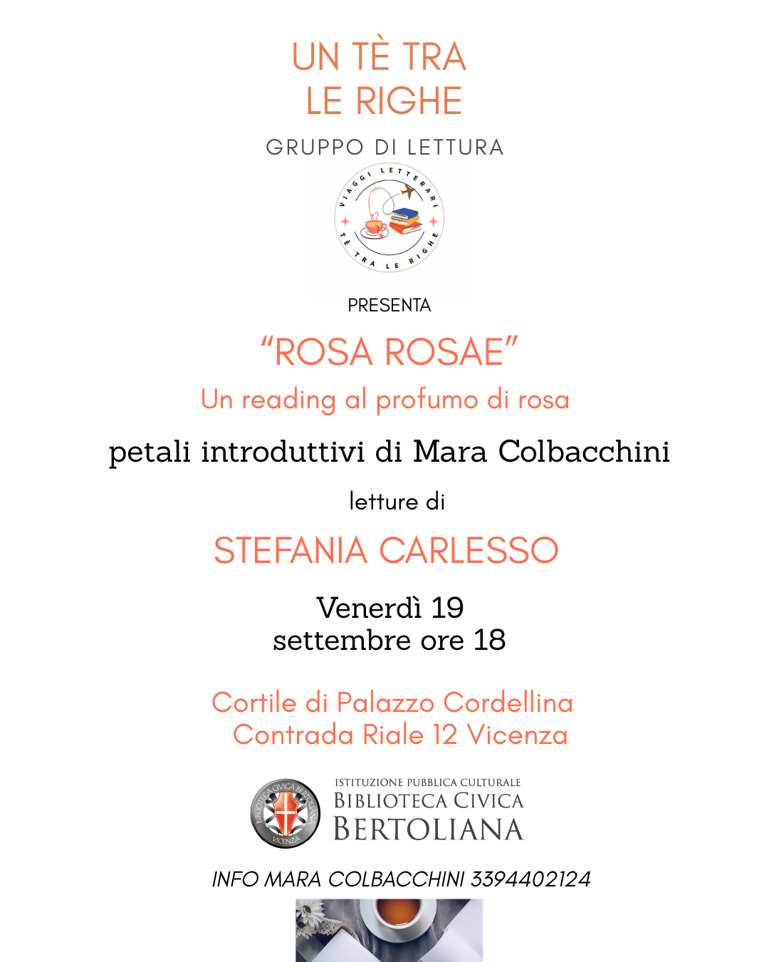 La magia della lettura incontra il fascino intramontabile delle rose. Venerdì 19 settembre alle ore 18, il suggestivo cortile di palazzo Cordellina (contra’ Riale 12) ospiterà il reading “Rosa rosae”, un appuntamento speciale organizzato dal gruppo di lettura Un tè tra le righe, in collaborazione con la Biblioteca civica Bertoliana.