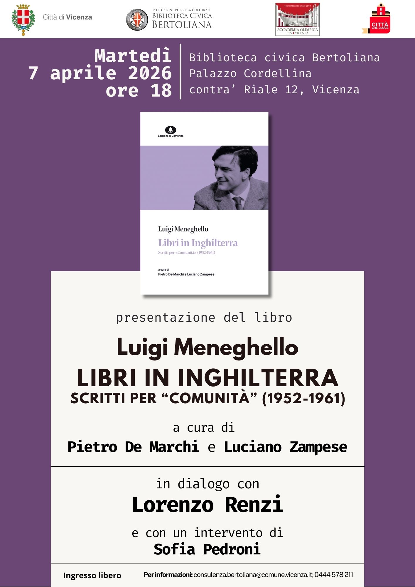 La Biblioteca civica Bertoliana, in collaborazione con l'Accademia Olimpica, presenterà il volume "Libri in Inghilterra. Scritti per Comunità (1952-1961)" di Luigi Meneghello martedì 7 aprile alle 18 a Palazzo Cordellina, in contra' Riale 12.