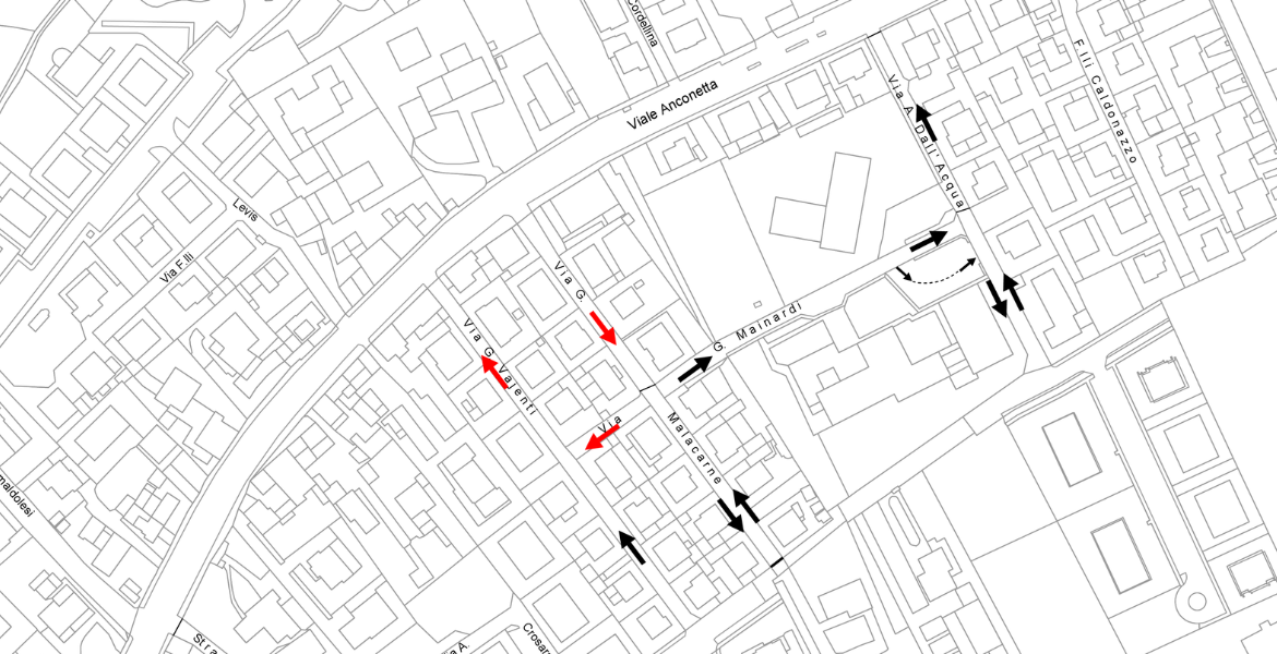 Il nuovo dispositivo di circolazione prevede l’istituzione del senso unico in via Malacarne da viale Anconetta verso via Mainardi, il senso unico in via Mainardi da via Malacarne verso via Vajenti, e in via Vajenti da via Mainardi verso Viale Anconetta.