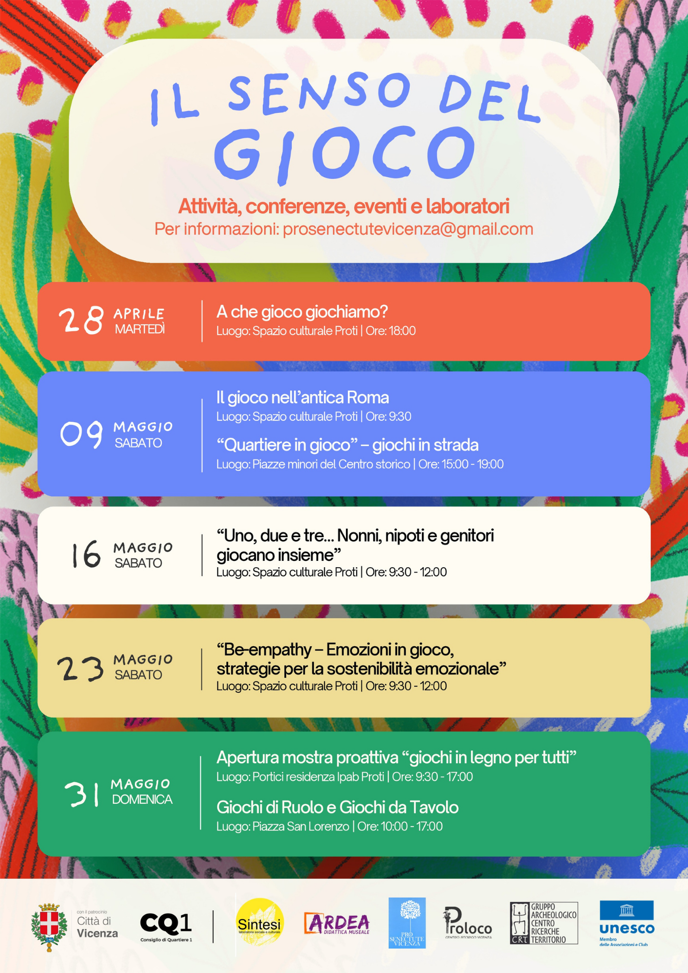 Il 9 maggio, alle 9:30, nello Spazio culturale Proti, si tiene la relazione di Elena Marzola su “Il gioco nell’antica Roma”, un viaggio nella storia cimentandoci negli antichi giochi da tavolo, curato da Aassociazione Ardea e Gruppo archeologico Centro Ricerche Territorio. Sempre il 9 maggio, dalle 15 alle 19, in varie piazze del Centro, “Quartiere in gioco” promosso dal Consiglio di Quartiere 1: Casa Provvidenza S. Domenico, a cura di Faiberica; Parrocchia Carmini: Scout e comunità parrocchiale dei Carmini; Centro Proti: giochi da tavolo Magnogato -Tana dei Goblin; scuola media Maffei: Ludobus a cura di Fate per Gioco; piazza delle Erbe: simultanea di Scacchi a cura del CSVP; Caccia al Tesoro itinerante a cura di Aster3 con partenza dalla parrocchia dei Carmini. Il pomeriggio si concluderà con un aperitivo conviviale ai Carmini a partire dalle 19.