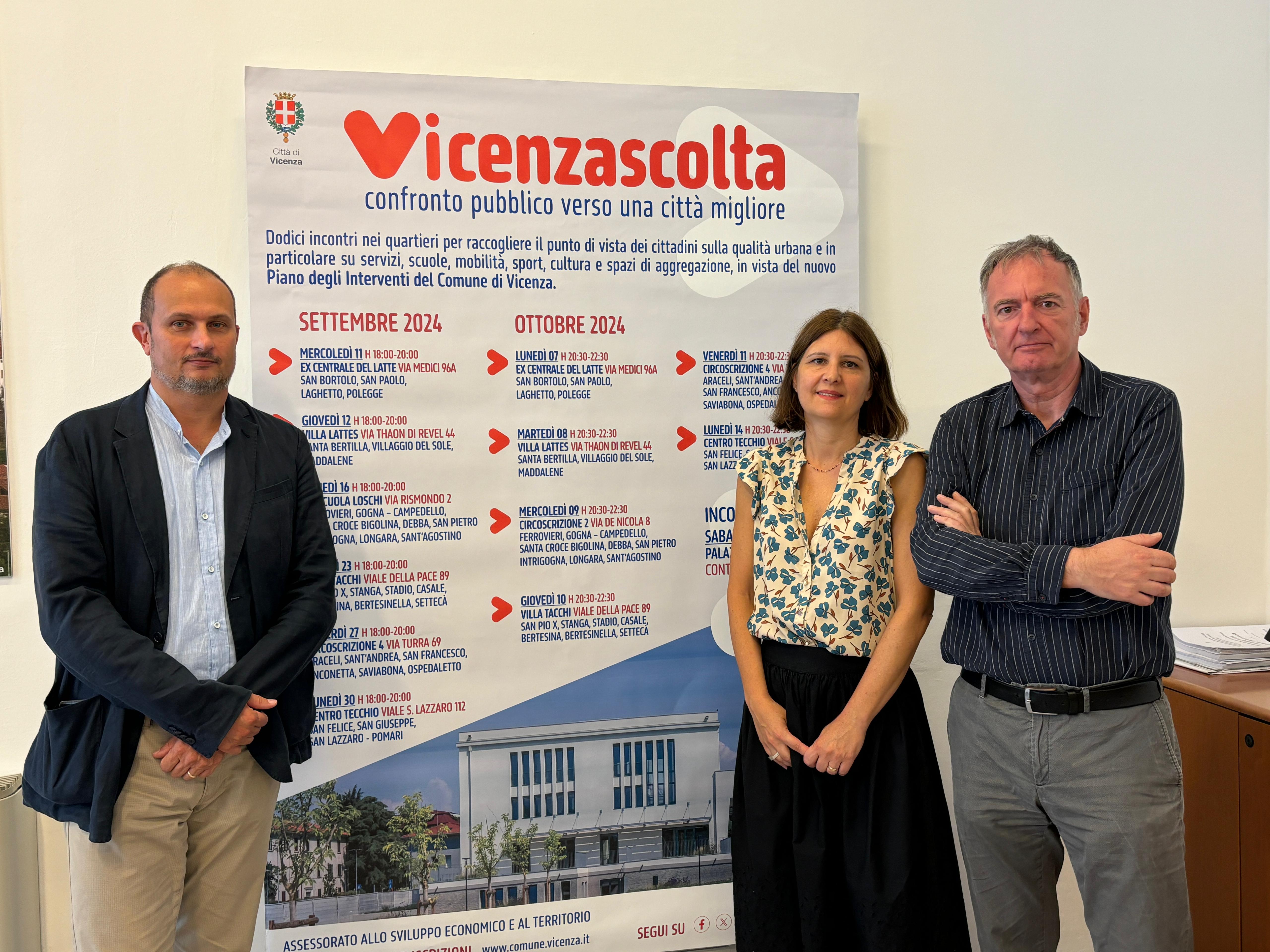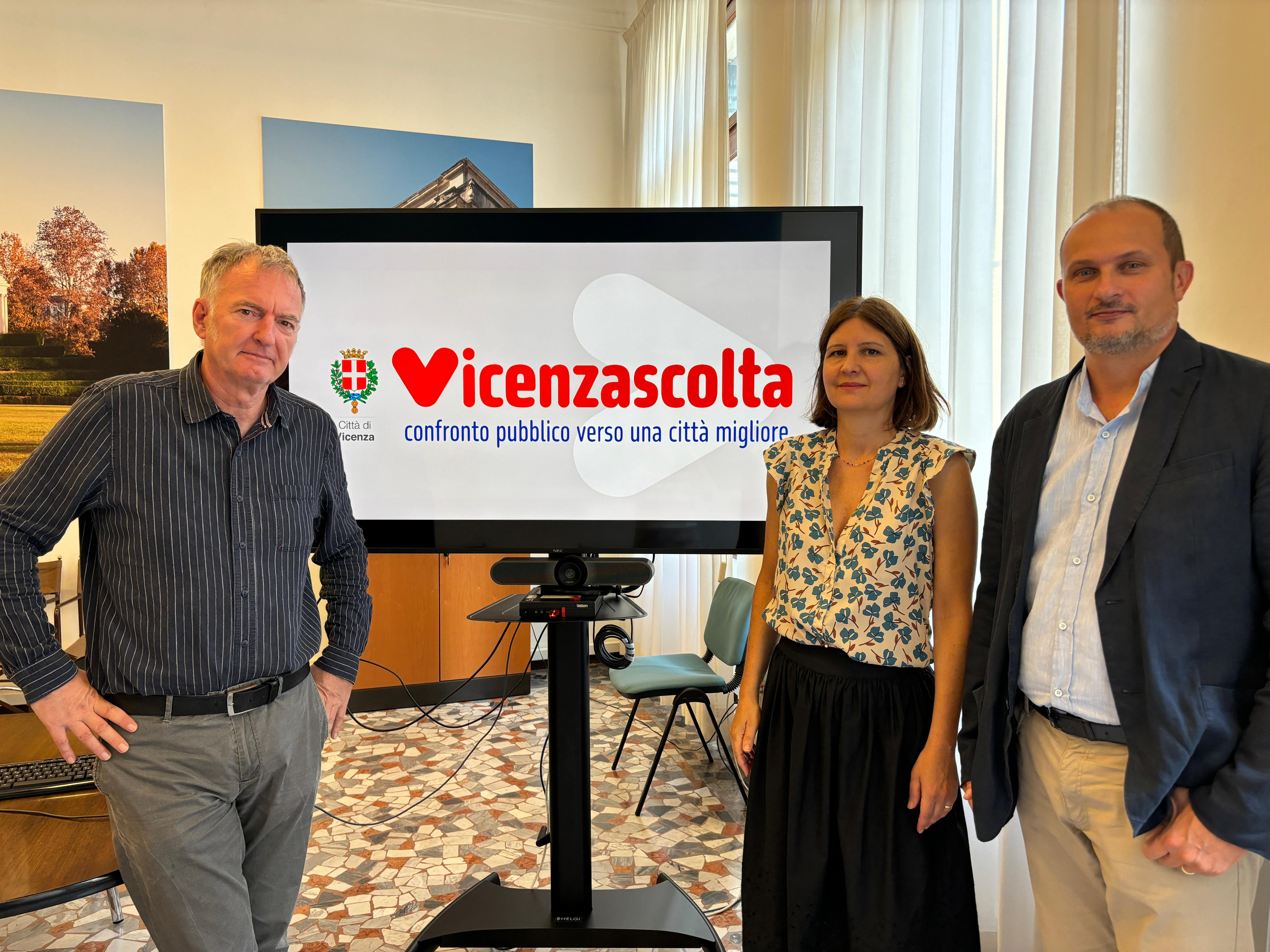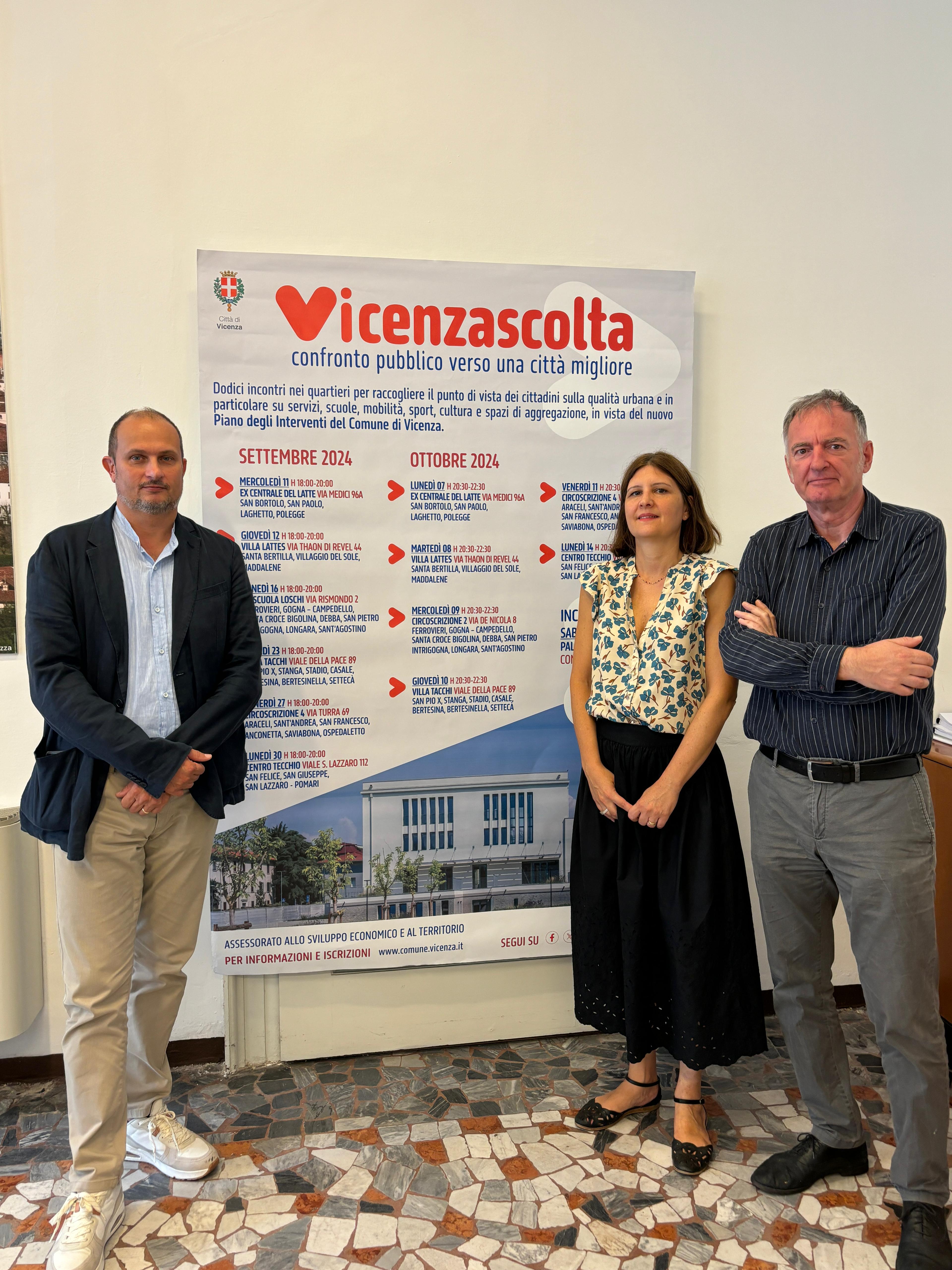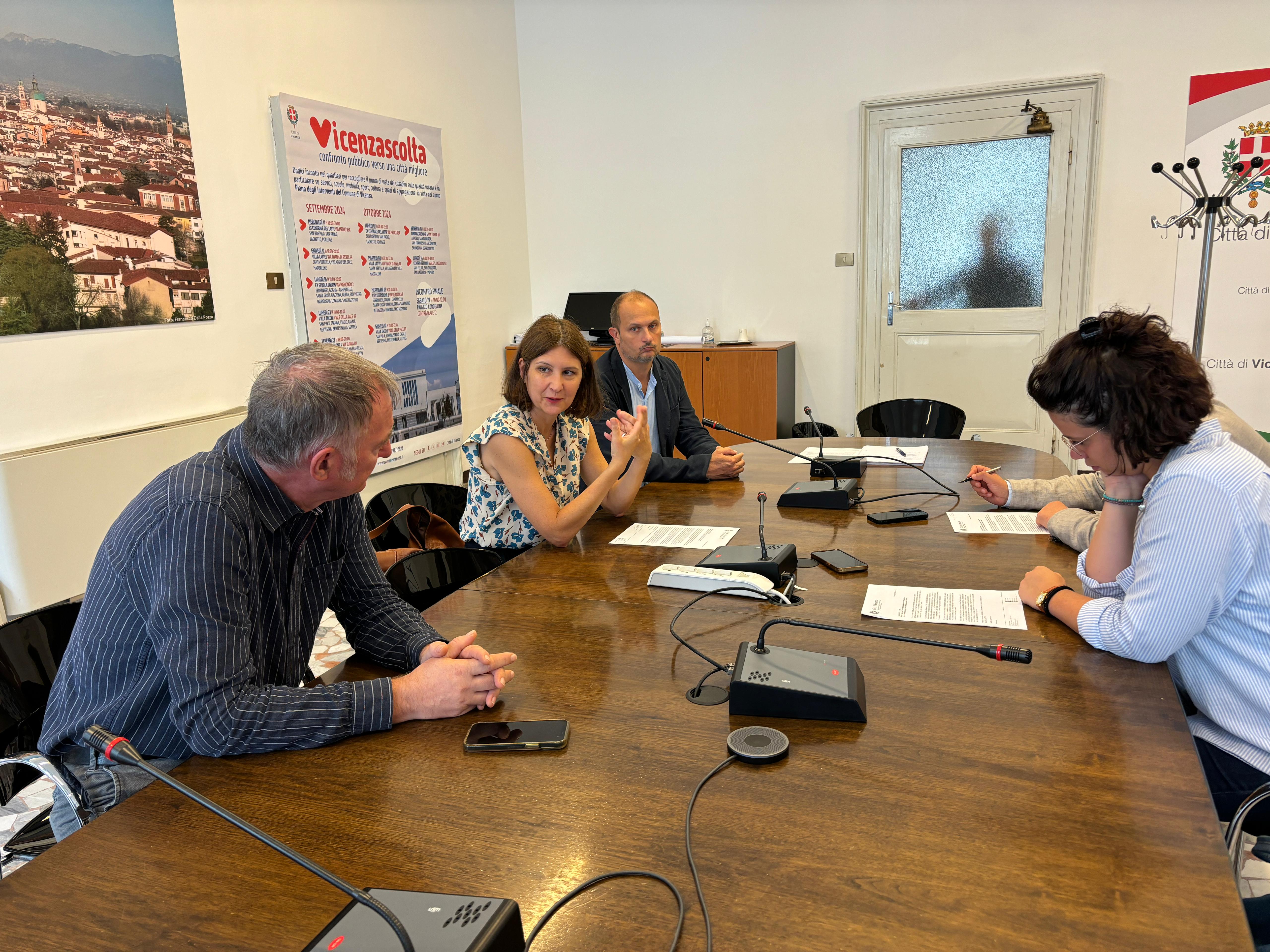 «Il percorso partecipativo “Vicenzascolta” offre l’opportunità ai cittadini di indicare all’amministrazione comunale le priorità di intervento – ha dichiarato l’assessora al territorio Cristina Balbi, presentando oggi a palazzo Trissino l’iniziativa assieme all’architetto Andrea Mariotto dello IUAV e all’architetto Damiano Savio del Settore Urbanistica comunale -. Un totale di 12 incontri-laboratori, due per zona, tra l’11 settembre e il 14 ottobre, nei quali emergerà il punto di vista degli abitanti, dopo una fase che ha visto coinvolti tutti i produttori di servizi, tra assessorati, aziende, cooperative, categorie economiche e associazioni».
