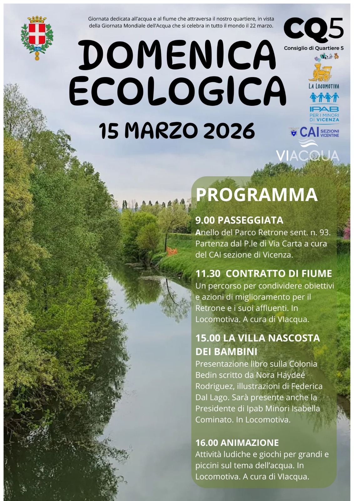 Il 15 marzo la domenica ecologica torna con attività, a cura del consiglio di quartiere 5 e con la collaborazione di La Locomotiva, IPAB per i minori di Vicenza, CAI Sezioni vicentine, ViAcqua. Si svolgerà inoltre la manifestazione sportiva StrAVicenza, motivo per cui sarà previsto il blocco alla circolazione in centro storico, nell’area all’interno delle mura storiche, dalle 9 alle 13.