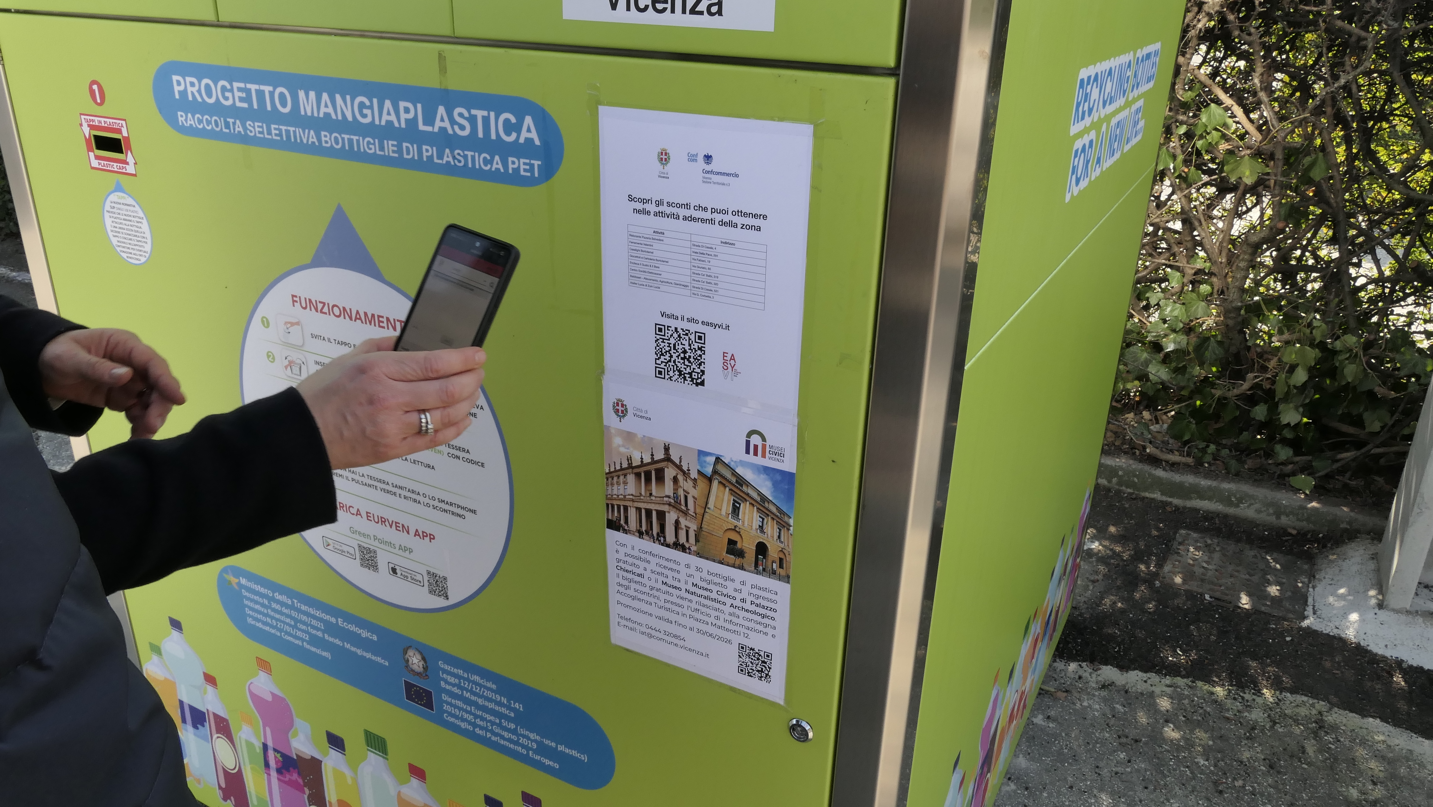Anche Confcommercio ha deciso di sostenere il “mangiaplastica”, offrendo la possibilità di convertire i “punti”, almeno venti, corrispondenti ad altrettante bottiglie, in sconti presso i negozi che hanno aderito al progetto e che vengono segnalati nella sezione eventi del sito EasyVi.it oppure inquadrando il QR Code presente sul display dell’Eco-compattatore.