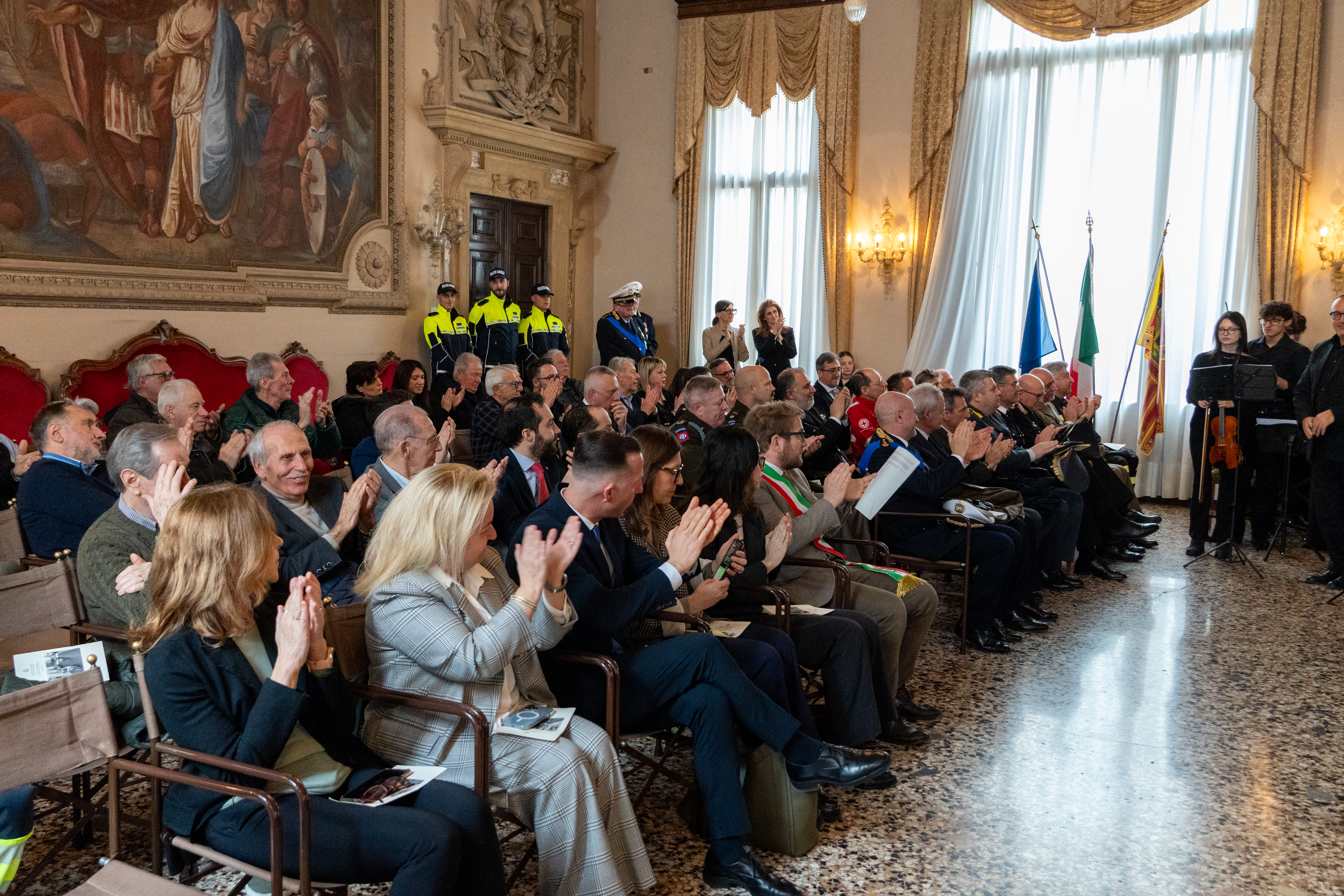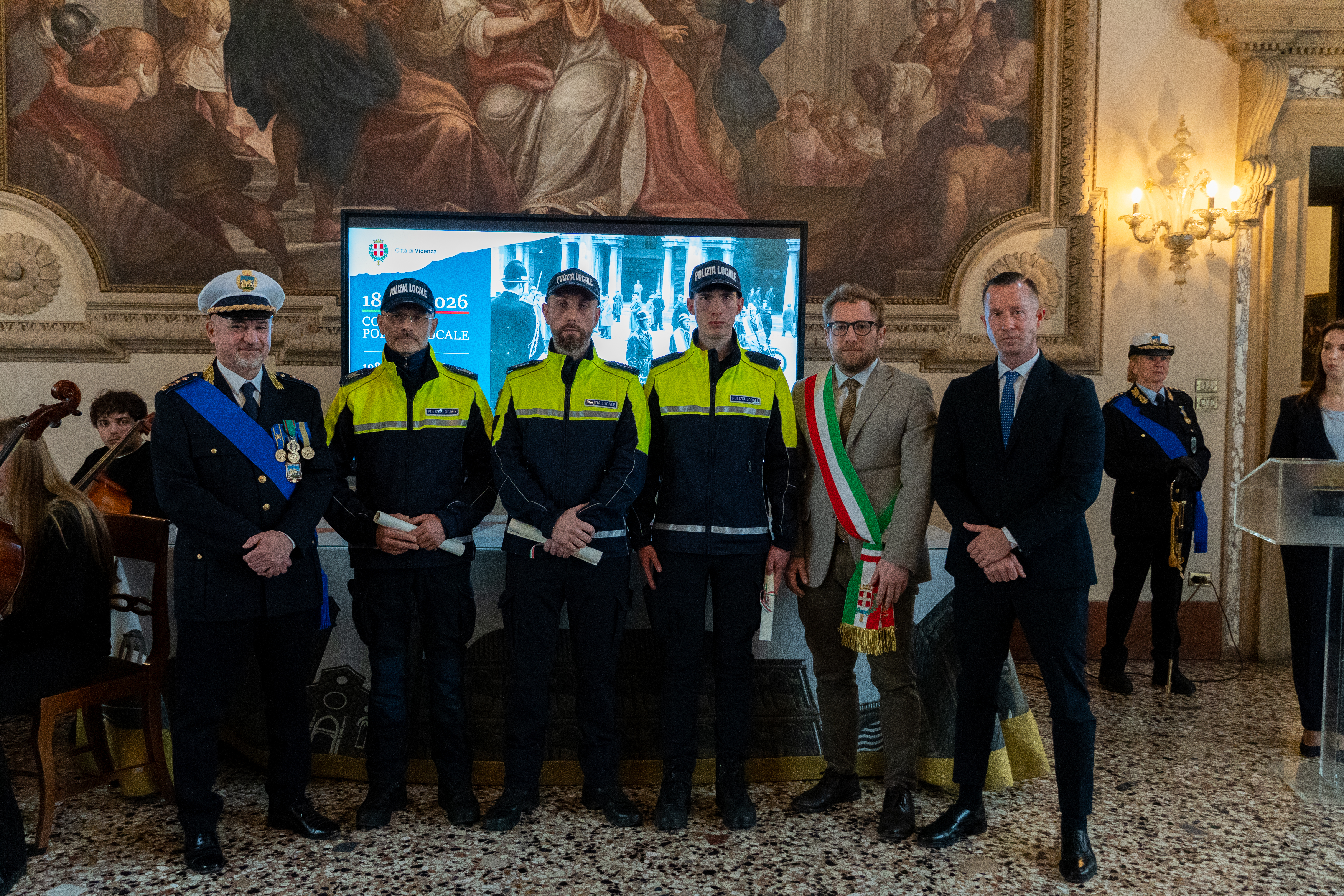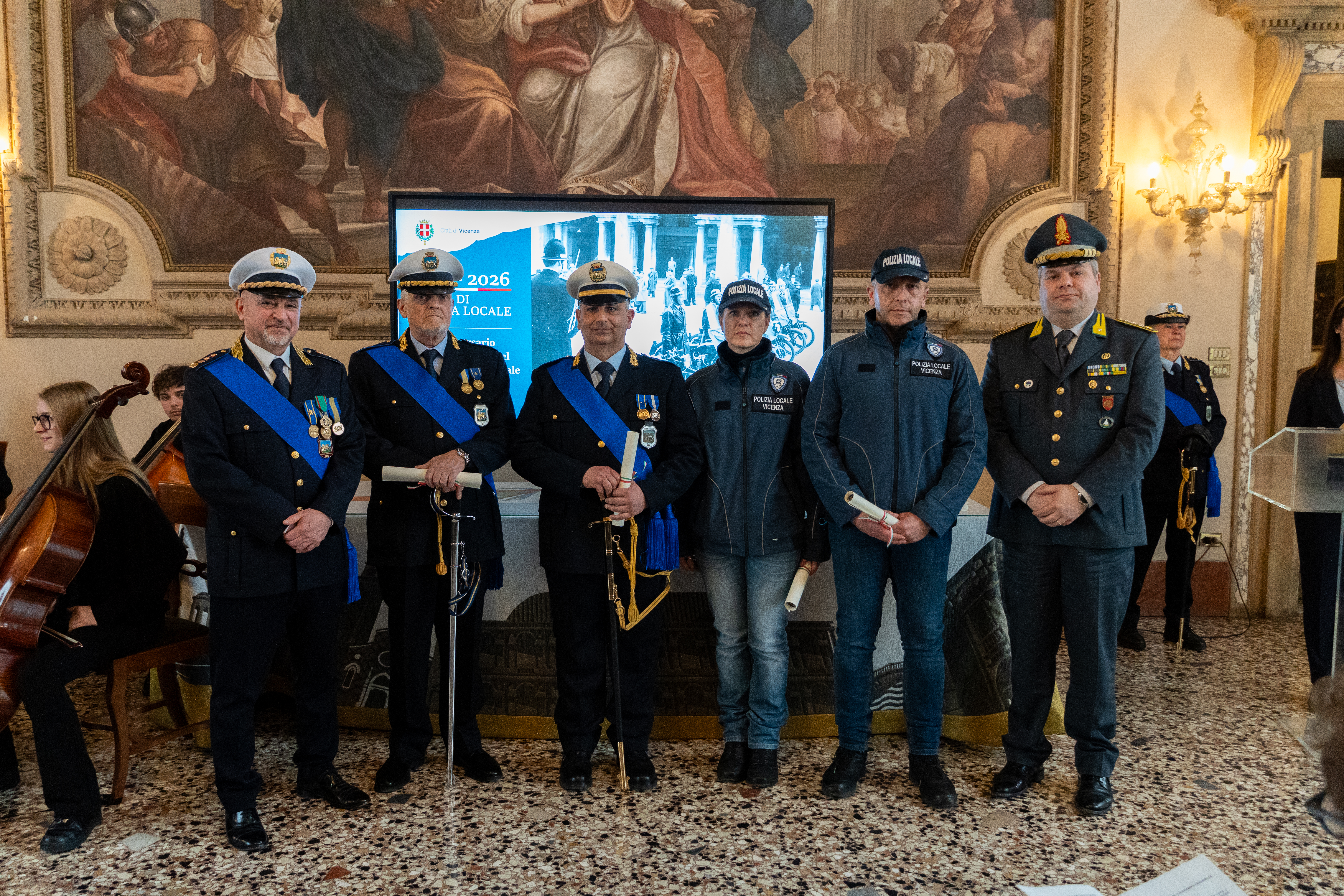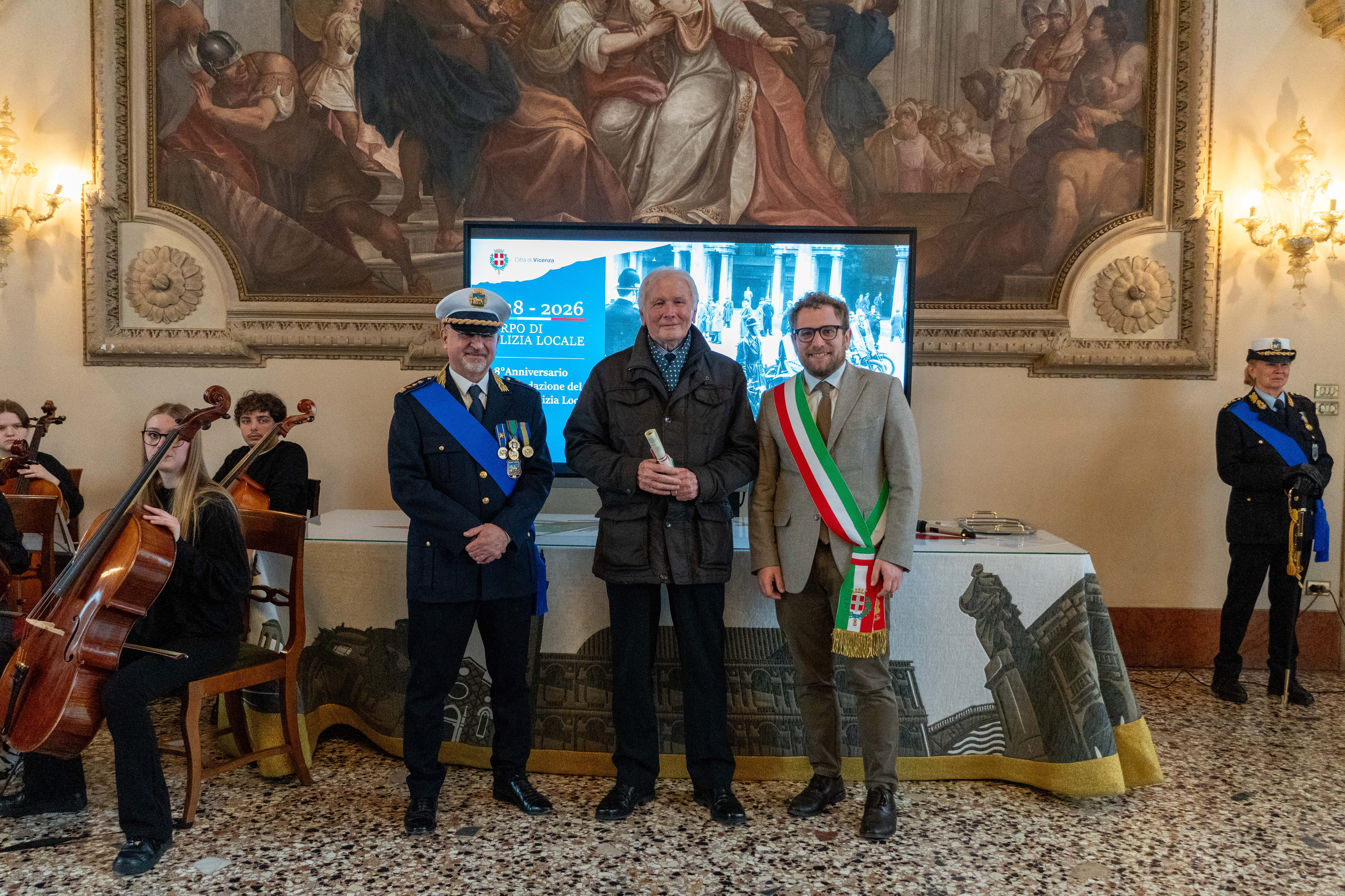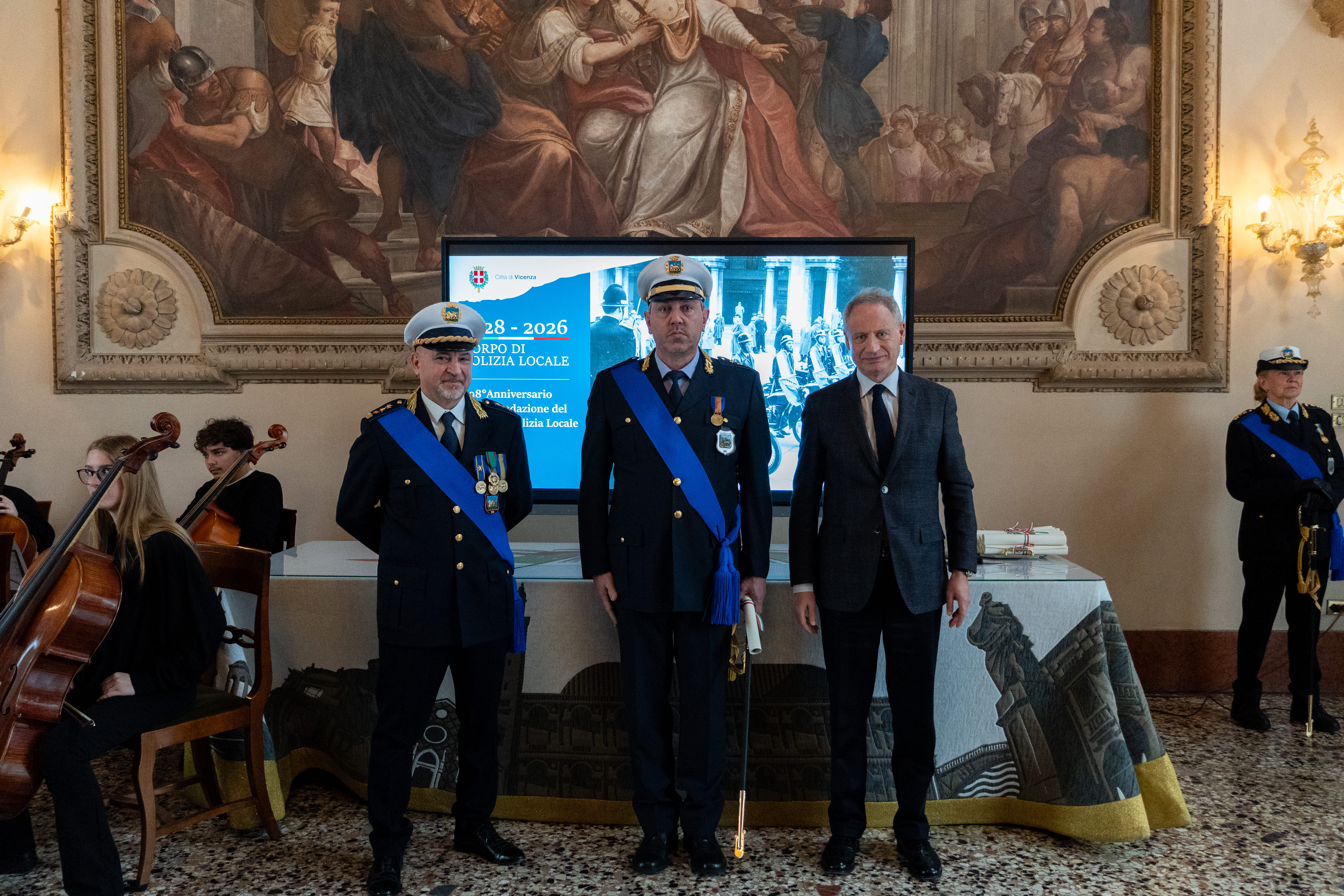 Spazio poi all’intervento del sindaco di Vicenza Giacomo Possamai: «Autorità civili, militari e religiose, Comandante Parolin, donne e uomini della Polizia Locale, Cittadine e cittadini, è con grande piacere che porto il saluto della città di Vicenza in occasione del 198° anniversario della fondazione del Corpo di Polizia Locale, una presenza storica e fondamentale per la nostra comunità, che dal 1828 accompagna la vita della città e ne tutela l’equilibrio e la convivenza civile. Questa cerimonia, che da qualche anno ospitiamo qui in Sala Stucchi, vuole essere un’occasione per riconoscere e mettere in luce il valore quotidiano di un servizio che le donne e gli uomini della Polizia Locale svolgono spesso lontano dai riflettori, ma che incide profondamente sulla qualità della vita dei cittadini. Viviamo in un tempo complesso, attraversato da cambiamenti rapidi e da nuove fragilità: sociali, economiche, urbane. Le città sono luoghi vivi, dinamici, ma anche esposti a tensioni e criticità che richiedono attenzione, presenza e capacità di ascolto. In questo contesto, il ruolo della Polizia Locale è diventato sempre più centrale. La sicurezza, infatti, non è soltanto contrasto ai reati. È anche ordine, vivibilità degli spazi pubblici, rispetto delle regole condivise. È presenza quotidiana nei quartieri, è prossimità, è capacità di mediazione nei conflitti, è ascolto delle esigenze dei cittadini. La Polizia Locale incarna tutto questo. È il primo volto delle istituzioni che molti cittadini incontrano. È il presidio più vicino, più immediato, più umano. È quella presenza che rassicura, che interviene, che accompagna. Una presenza che sa essere autorevole, ma anche attenta e sensibile alle fragilità. A Vicenza, questo si traduce in un impegno concreto e costante: nella gestione del traffico e della mobilità, nella tutela della sicurezza urbana, nei controlli sul territorio, nel contrasto al degrado, ma anche nella collaborazione quotidiana con le altre forze dell’ordine e con tutti gli attori istituzionali. Una collaborazione che rappresenta un valore aggiunto fondamentale. Perché la sicurezza è un bene comune che si costruisce insieme, attraverso il coordinamento, la fiducia reciproca e una visione condivisa della città. Oggi, più che mai, abbiamo bisogno di una sicurezza che sia anche coesione sociale. Che sappia coniugare il rispetto delle regole con l’inclusione. Che non si limiti a intervenire sulle conseguenze, ma che sappia contribuire a prevenire le cause del disagio. In questo, la Polizia Locale svolge un ruolo prezioso: non solo come garante dell’ordine, ma come parte attiva nella costruzione di una comunità più giusta, più attenta, più solidale. A nome di tutta la città di Vicenza, desidero quindi rivolgere un sincero ringraziamento al Comandante Massimo Parolin e a tutte le donne e gli uomini della Polizia Locale: per la professionalità, per il senso del dovere, per la dedizione con cui svolgete ogni giorno il vostro lavoro. Grazie per esserci sempre, nei momenti ordinari e in quelli più difficili. Grazie per la vostra presenza, che rende Vicenza una città più sicura e più vivibile. Buon anniversario e grazie, di cuore».