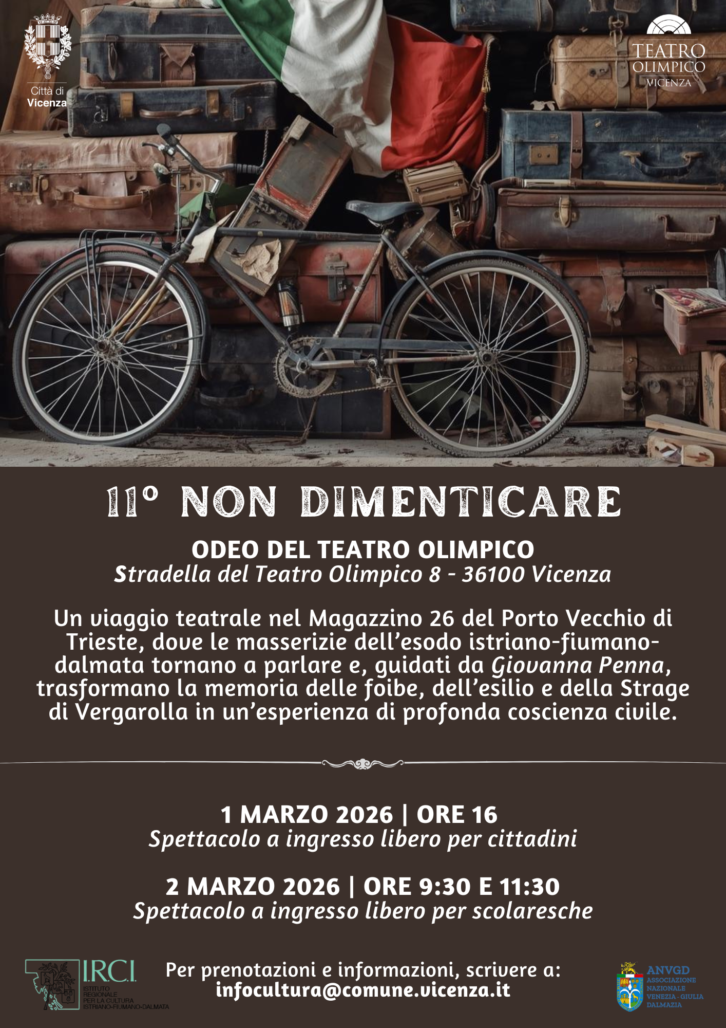 Il programma prevede anche lo spettacolo “11° Non dimenticare”, organizzato dal Comune di Vicenza sempre in collaborazione con l’associazione Anvgd, che si terrà all’Odeo del Teatro Olimpico, stradella del Teatro Olimpico 8: domenica 1 marzo alle 16 per i cittadini (ingresso libero, prenotazioni e informazioni infocultura@comune.vicenza.it) e lunedì 2 marzo alle 9.30 e alle 11.30 per le scolaresche. Un viaggio teatrale nel Magazzino 26 del Porto Vecchio di Trieste, dove le masserizie dell’esodo istriano-fiumano-dalmata tornano a parlare e, guidati da Giovanna Penna, trasformano la memoria delle foibe, dell’esilio e della strage di Vergarolla in un’esperienza di profonda coscienza civile.
