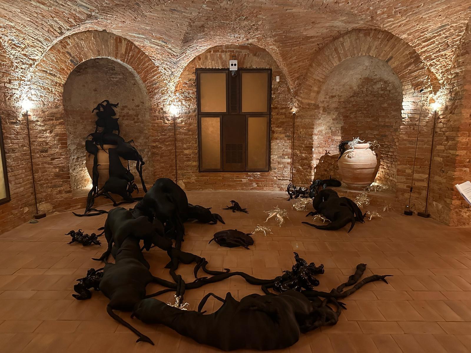 Tra il piano terra, il portico e l’ipogeo di Palazzo Thiene, si snoda un itinerario sorprendente e costantemente sospeso tra dimensione globale e radici intimamente locali. In mostra non solo per l’assoluta centralità dell’eccellenza dei grandi maestri vetrai di Berengo Studio, a Murano, ma anche per la presenza di artisti squisitamente veneti come Monica Bonvicini, Massimo Lunardon, cui si aggiunge chi, come la modenese Ornella Cardillo ha però scelto Venezia come città d’adozione. Un percorso espositivo che incanta per la presenza della più prestigiosa scena artistica mondiale contemporanea: figure di grande statura nazionale quali Emilio Isgrò, Alfredo Pirri, Michelangelo Pistoletto, e nomi internazionali del calibro di: Ai Weiwei, Vanessa Beecroft, Tony Cragg, Koo Jeong A, Marya Kazoun, Jaume Plensa, Laure Prouvost, Thomas Schütte, Sean Scully, Peter Shire, Pascale Marthine Tayou , Koen Vanmechelen, Robert Wilson, Erwin Wurm.