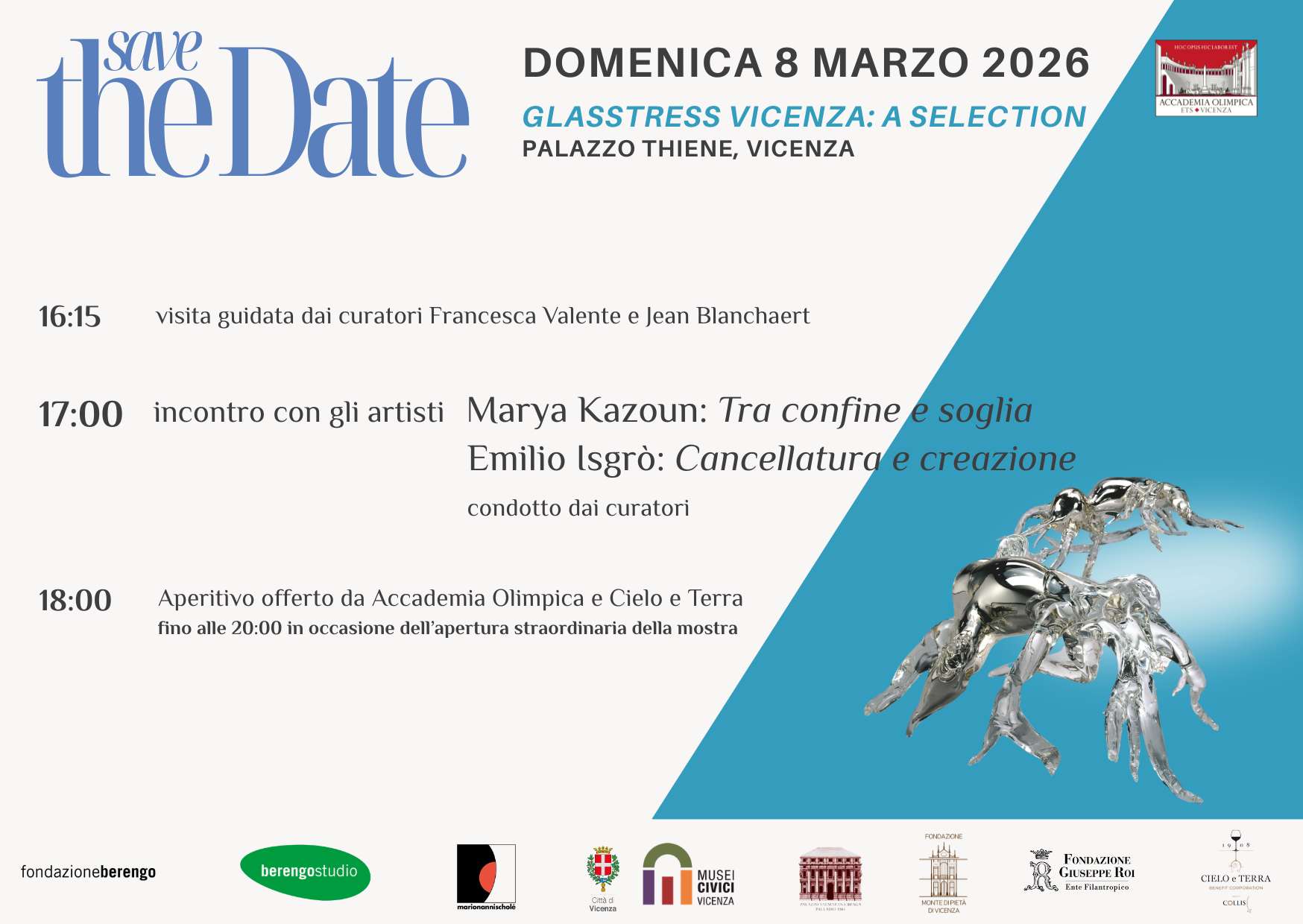 L’appuntamento sarà preceduto dalla visita guidata con i curatori alle 16.15. Sarà l’occasione per godere della rara opportunità di osservare la luce che anima e celebra il vetro nell’arte contemporanea: Mario Nanni racconterà il processo progettuale dell’illuminazione della mostra, insieme a preziosi approfondimenti sulle opere da parte dei curatori Francesca Valente e Jean Blanchaert.