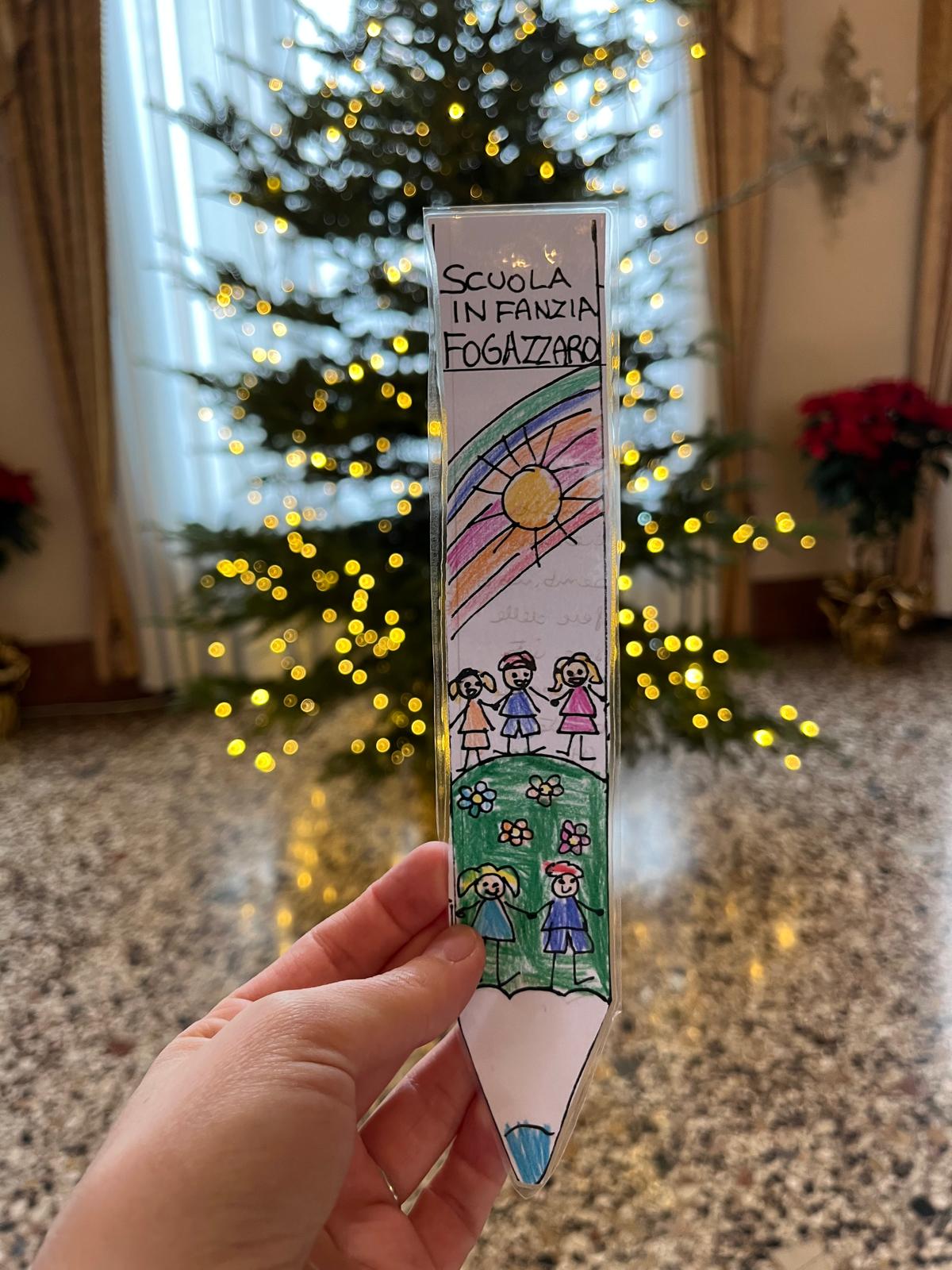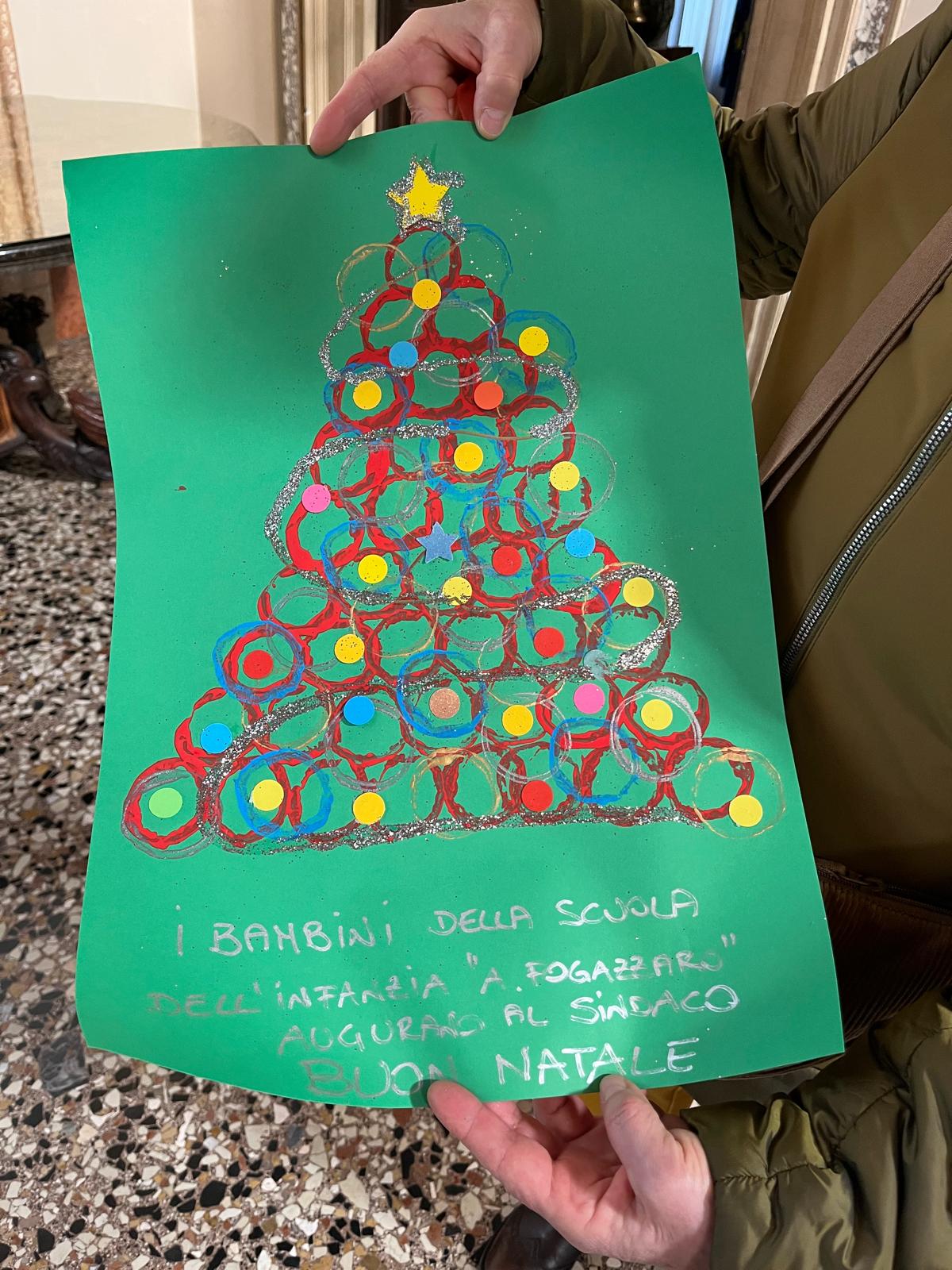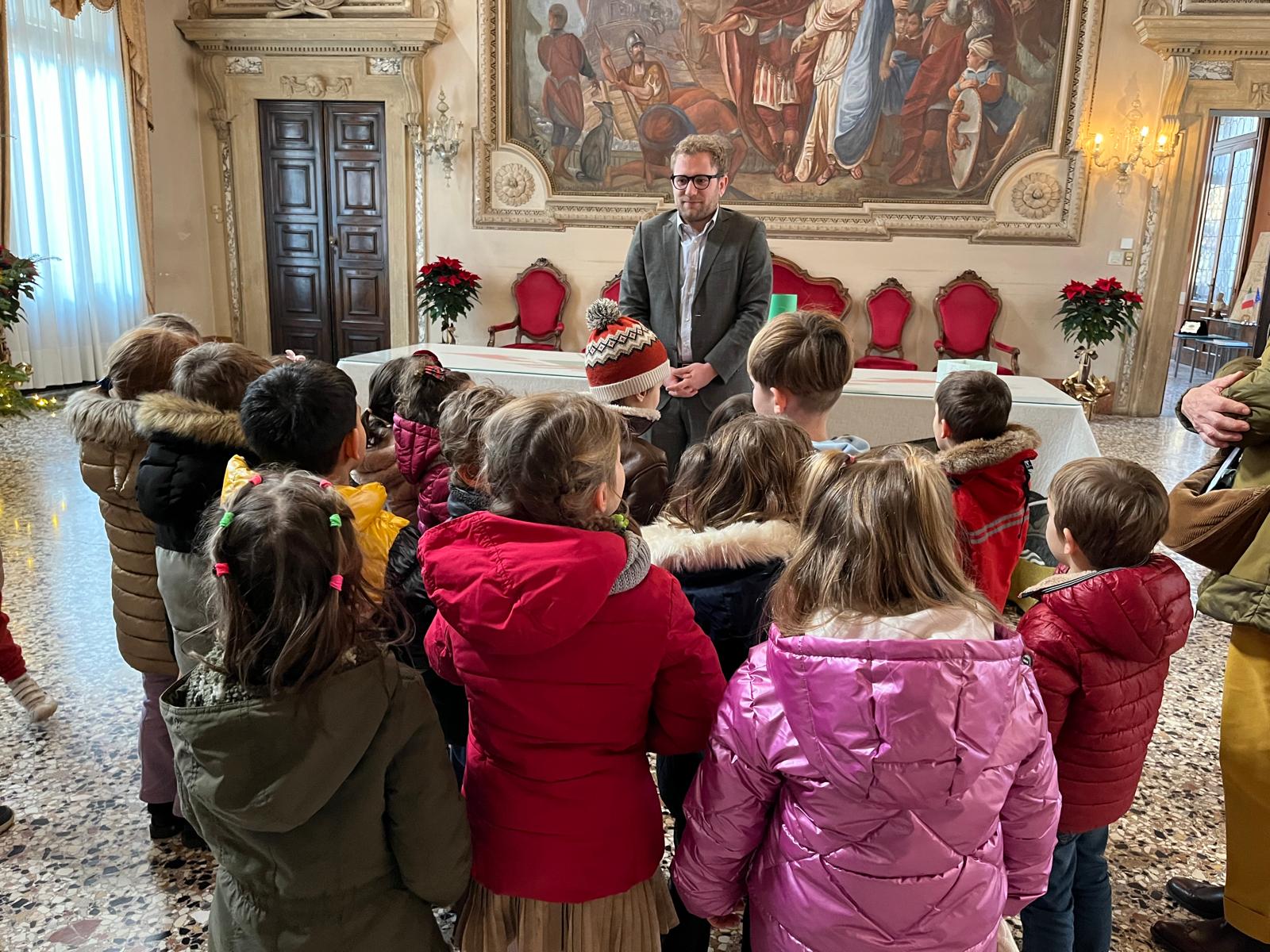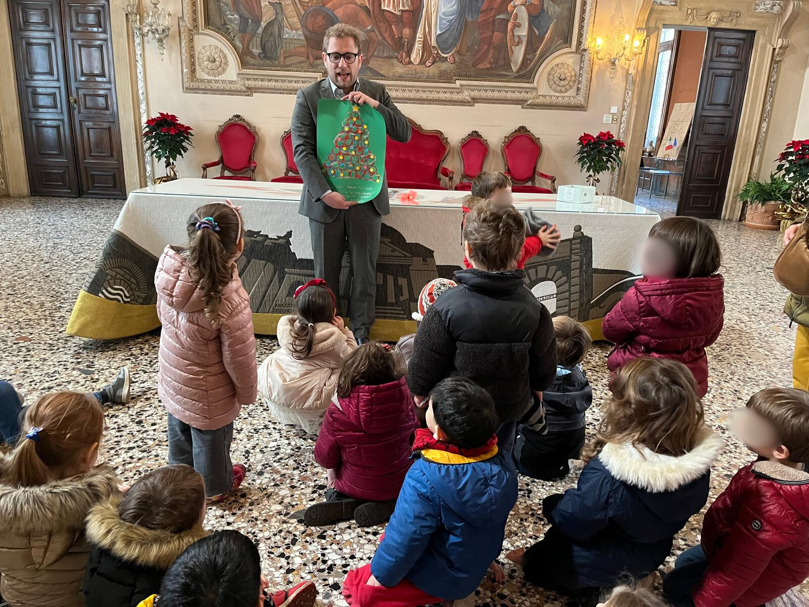 Una ventina di bambini della scuola dell’infanzia Fogazzaro ha fatto visita questa mattina al sindaco Giacomo Possamai per lo scambio degli auguri di Natale e per consegnare alcuni doni speciali. I piccoli alunni dai quattro ai cinque anni, in rappresentanza dell’intera scuola che conta un centinaio di iscritti, sono stati accolti nella sala degli Stucchi di Palazzo Trissino. Al sindaco sono stati consegnati una locandina, che ritrae un albero allestito con l’augurio di “Buon Natale” da parte della scuola Fogazzaro, e il segnalibro, che bambini e maestre della scuola dell’infanzia stanno consegnando in giro per la città. Gli alunni sono stati accompagnati da tre insegnanti. «È un piacere accogliere questi bambini della scuola Fogazzaro, che da piccolino ho frequentato anche io, per degli auguri di Natale speciali rivolti a loro, all’intera scuola e alle famiglie», ha affermato il sindaco Giacomo Possamai. Prima di salutare il primo cittadino i bambini hanno anche recitato una poesia di Natale.