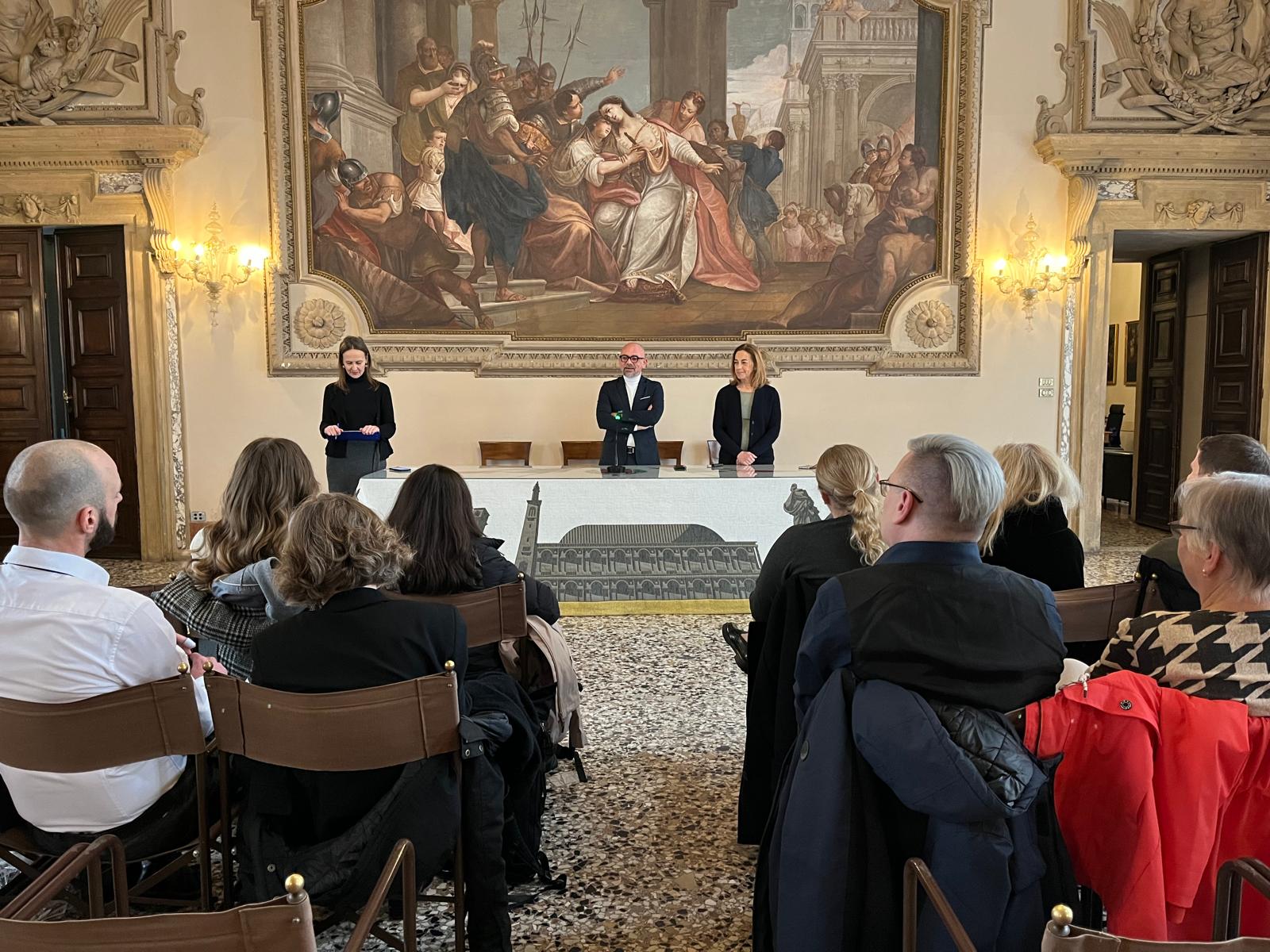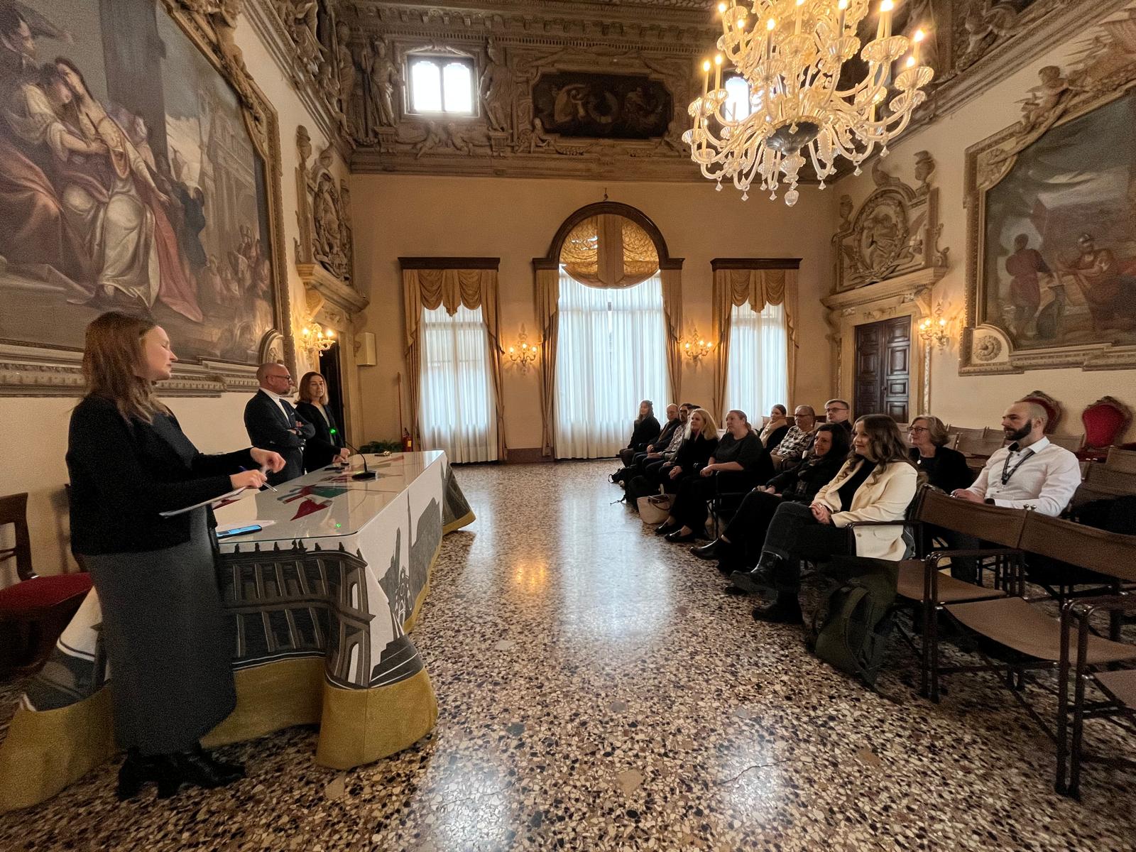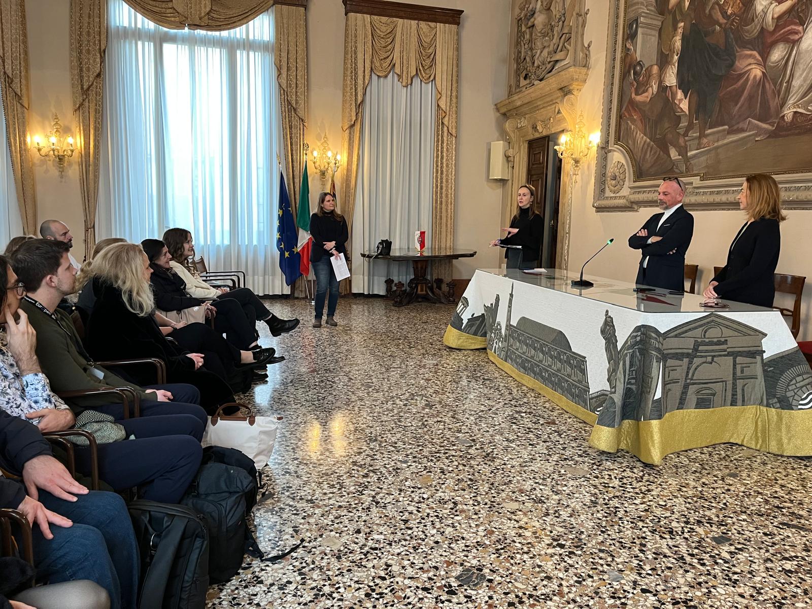 Il direttore generale Michela Cavalieri e l’assessore al personale Matteo Tosetto hanno accolto questa mattina, nella sala Stucchi di Palazzo Trissino, i 13 funzionari della città di Bonn, situata in Germania, arrivati a Vicenza per una visita dedicata allo studio del metodo e del funzionamento degli enti locali italiani. Nel corso del momento di accoglienza, direttore generale e assessore hanno presentato le peculiarità del Comune di Vicenza ai visitatori per poi passare ad un reciproco scambio di doni istituzionali.