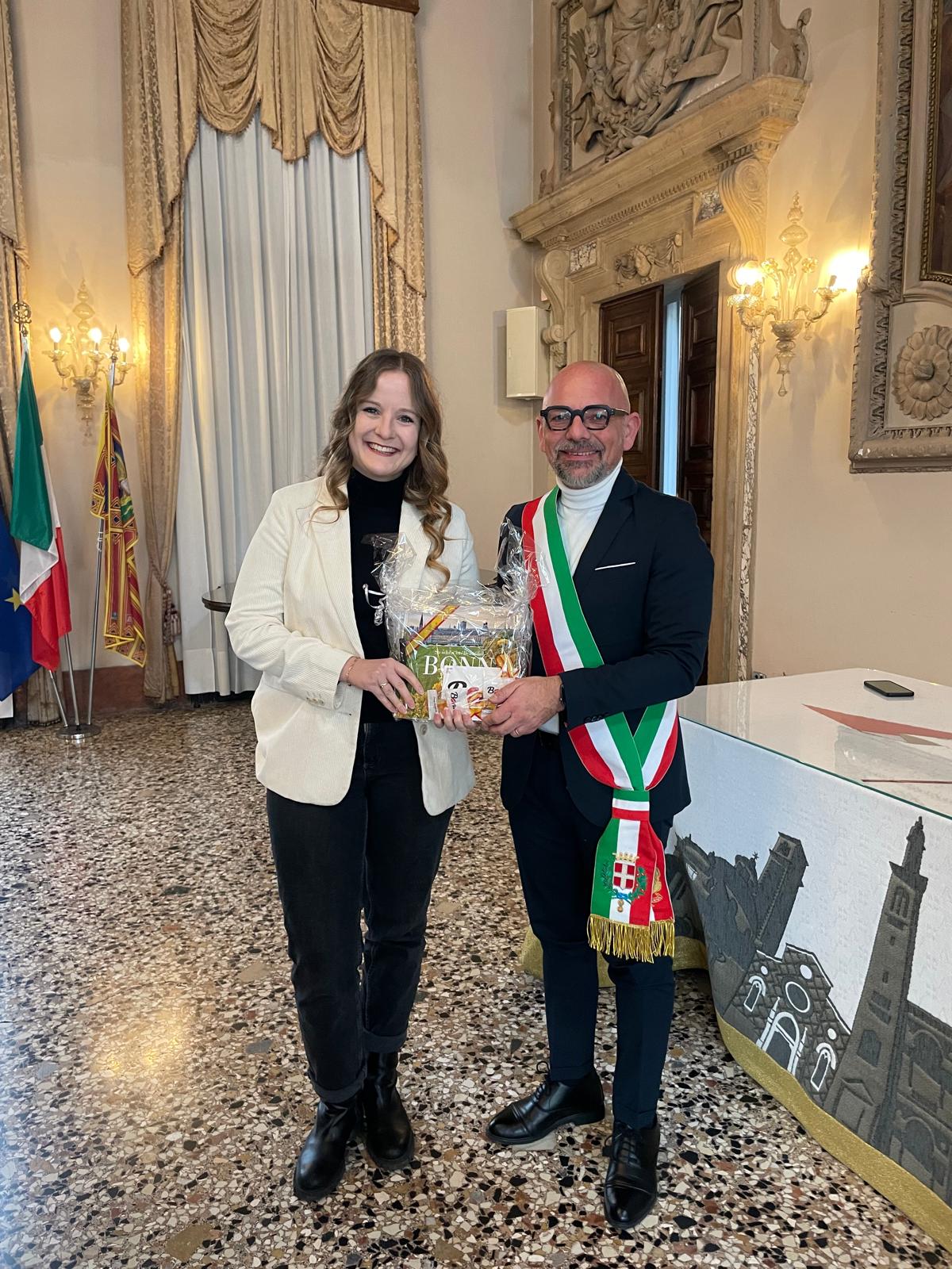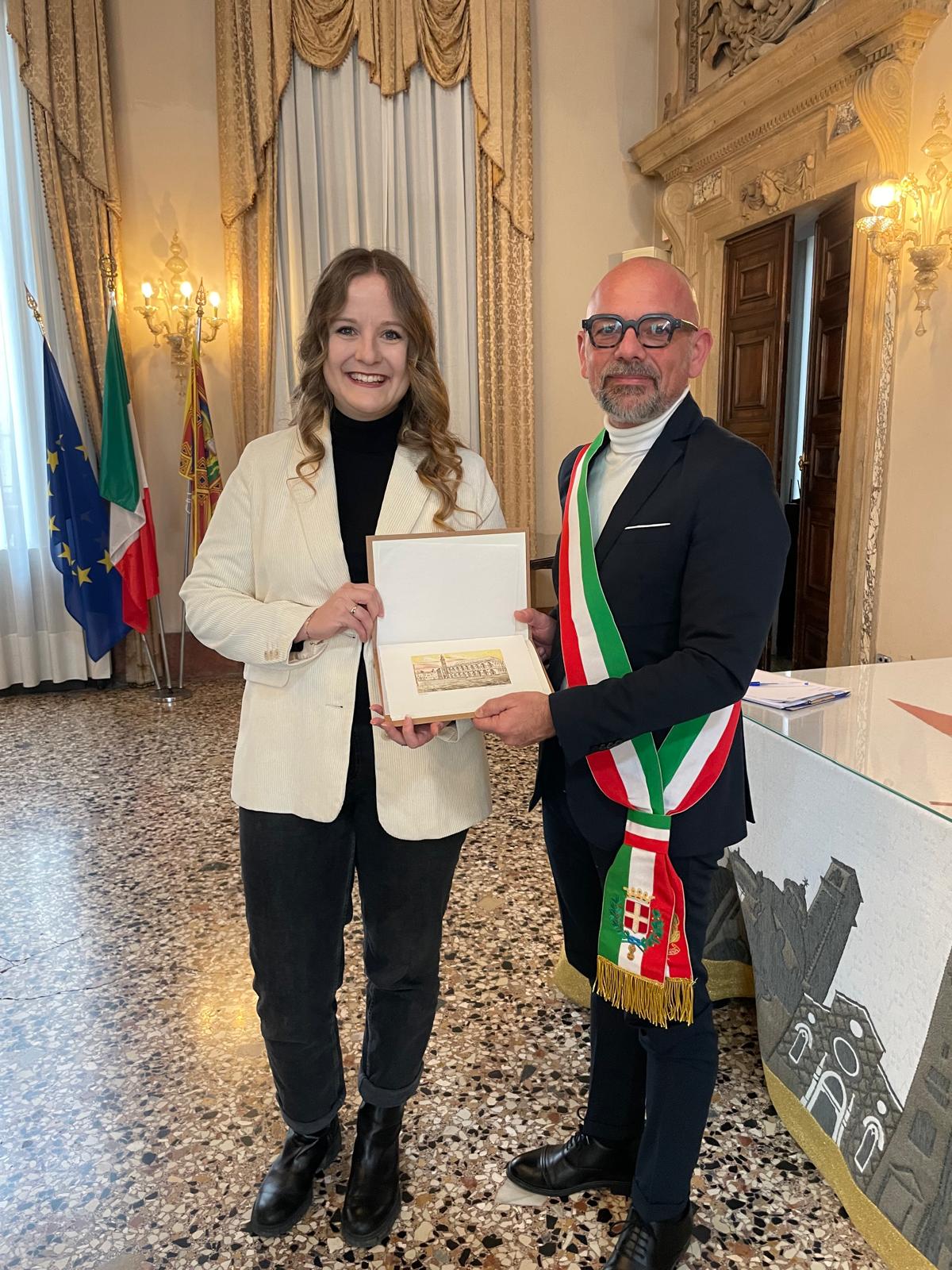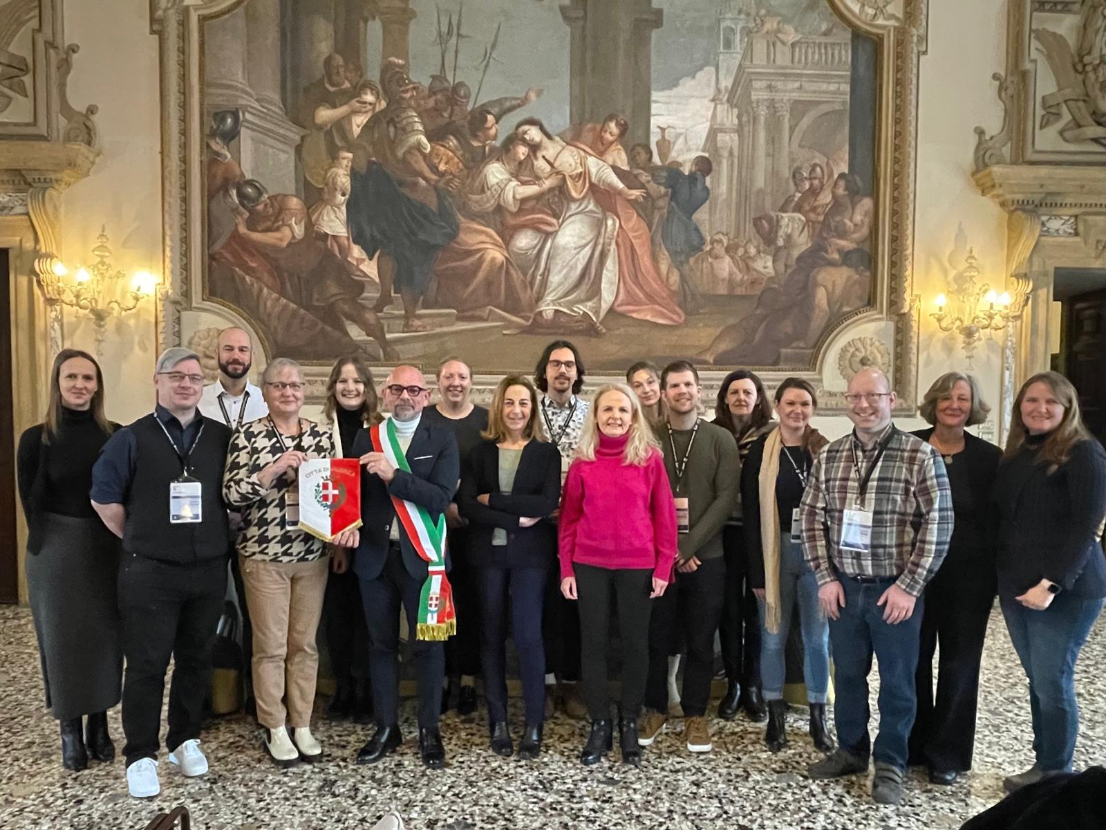 Il direttore generale Michela Cavalieri e l’assessore al personale Matteo Tosetto hanno accolto questa mattina, nella sala Stucchi di Palazzo Trissino, i 13 funzionari della città di Bonn, situata in Germania, arrivati a Vicenza per una visita dedicata allo studio del metodo e del funzionamento degli enti locali italiani. Nel corso del momento di accoglienza, direttore generale e assessore hanno presentato le peculiarità del Comune di Vicenza ai visitatori per poi passare ad un reciproco scambio di doni istituzionali.