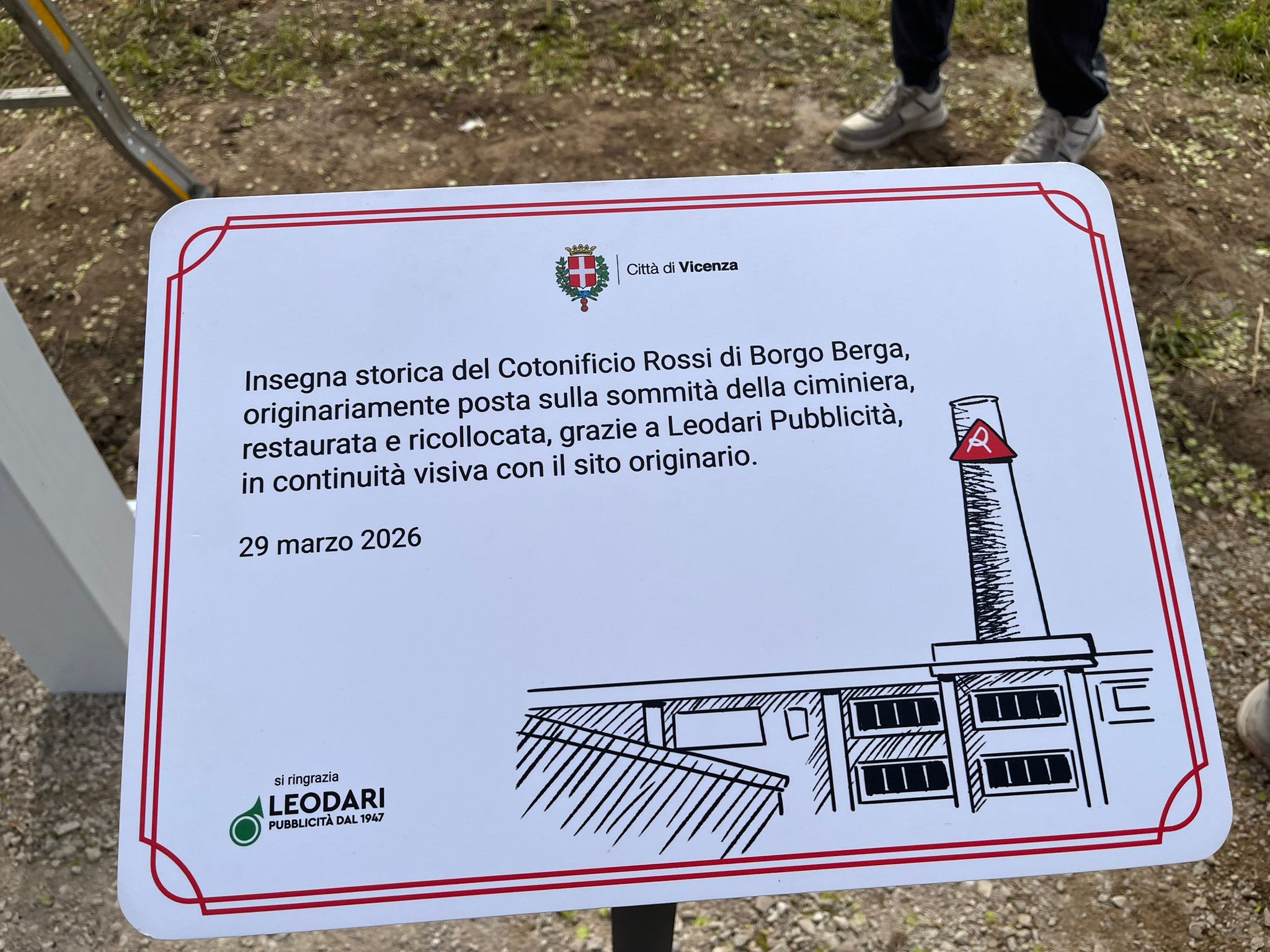 La cerimonia, alla quale hanno preso parte anche il vicepresidente del Consiglio regionale Francesco Rucco e il consigliere comunale Nicolò Naclerio, breve ma molto partecipata, dai componenti della famiglia Rossi, ma anche da numerosi tifosi del L.R. Vicenza, ha poi visto gli interventi di Leonardo Leodari e di Alvise Rossi, prima dello scoprimento della insegna e della targa che riporta la scritta: “Insegna storica del Cotonificio Rossi di Borgo Berga, originariamente posta sulla sommità della ciminiera, restaurata e ricollocata, grazie a Leodari Pubblicità, in continuità visiva con il sito originario”.