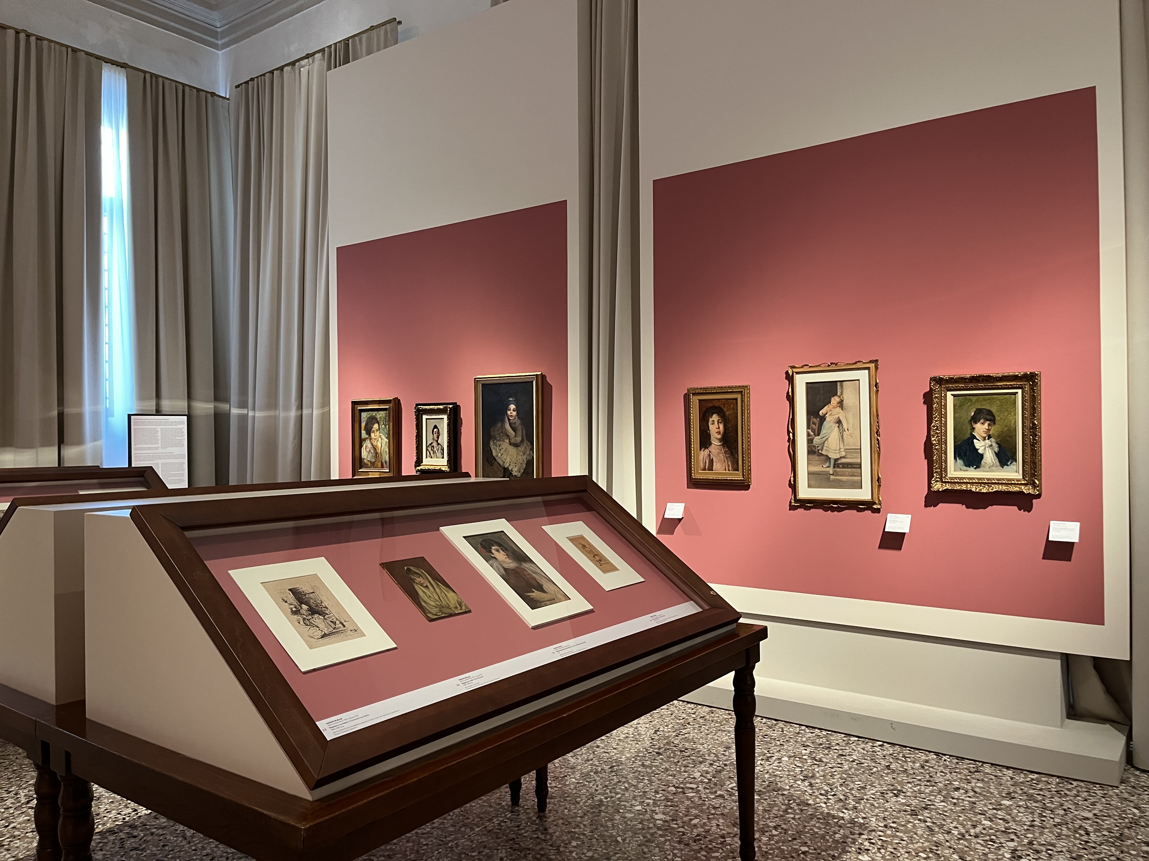 Tra i ritratti, nelle tipologie che vanno da quello intimo e sentimentale al genere della ‘testa di carattere’ e dello studio psicologico, spicca un capolavoro del genere, il Ritratto di ragazza (1870 ca.), di Giacomo Favretto (Venezia, 1849-1887), forse recante le fattezze della sua modella preferita, l’amata sorella Angela, la “Zanze”: stesura e impaginato ancora debitori degli insegnamenti del maestro Molmenti si saldano, in questo saggio di intensa introspezione psicologica, alla pittura d’Oltralpe di Manet o Fortuny, ancor prima dell’importante soggiorno parigino del 1878.