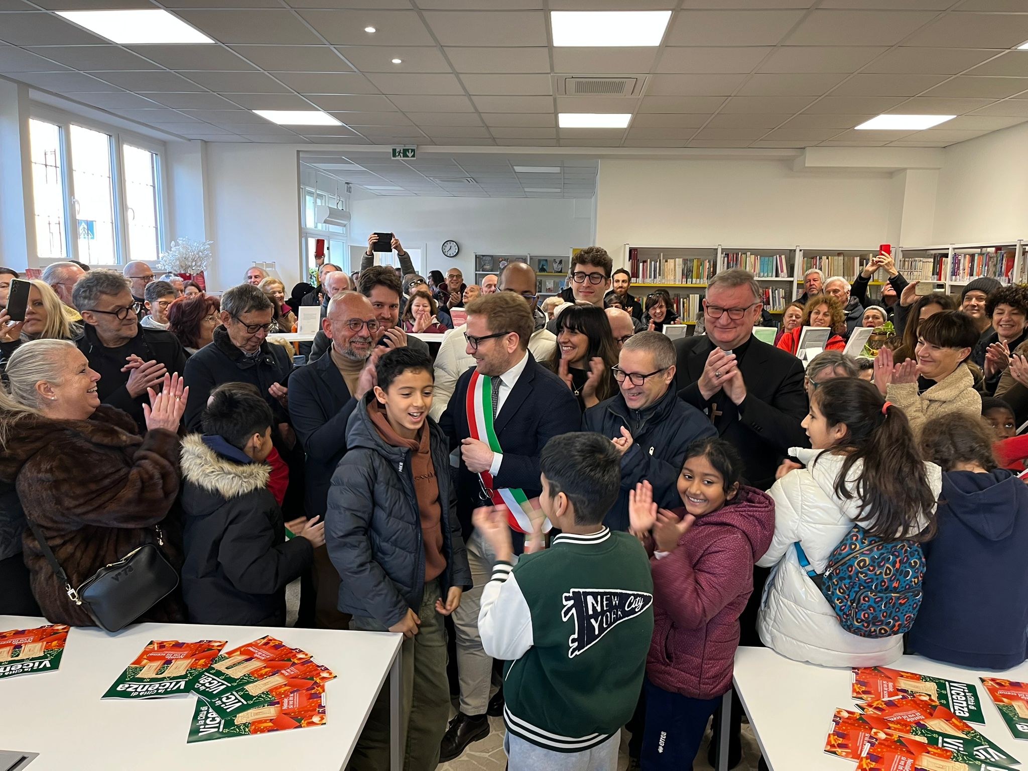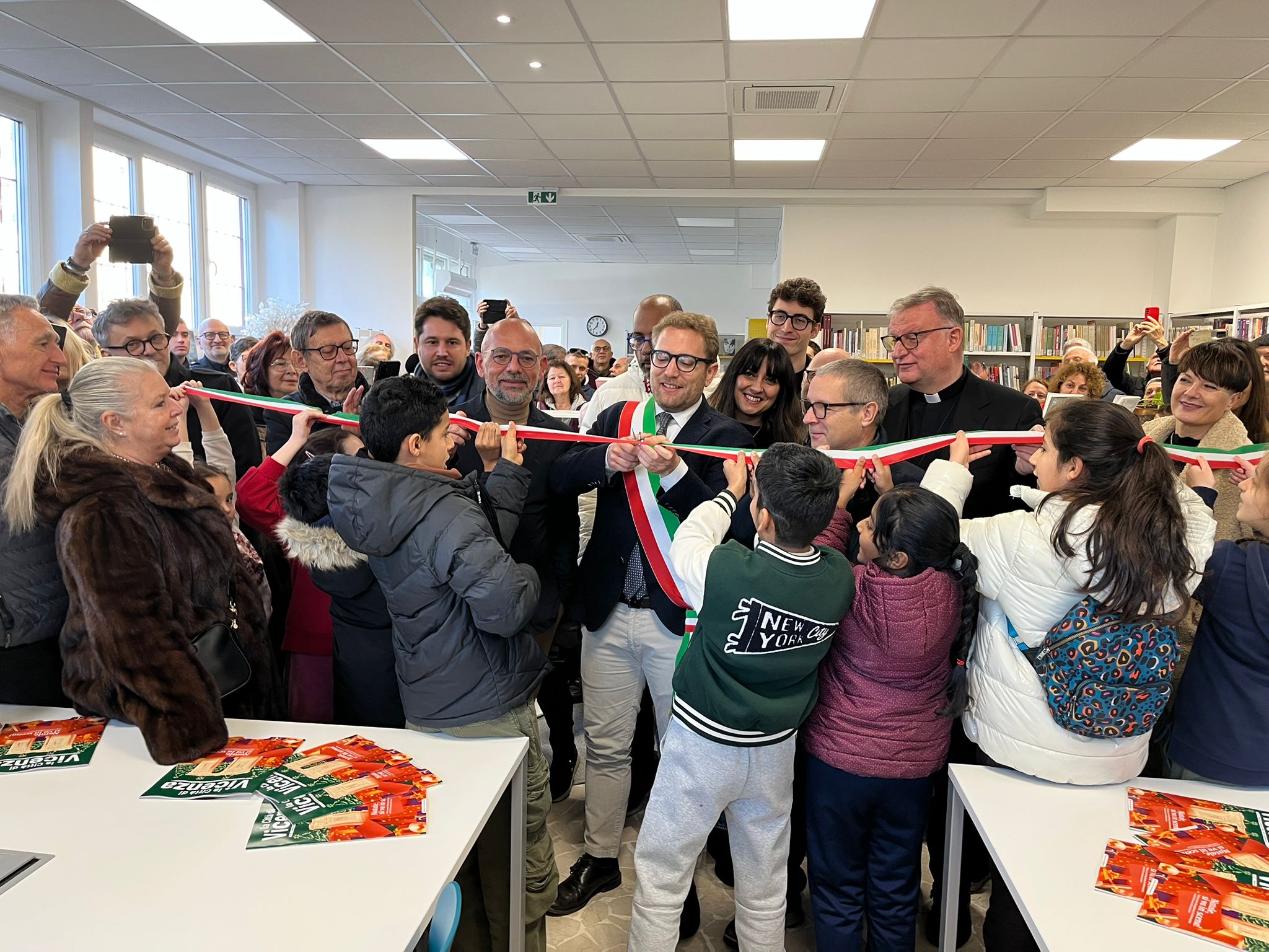 È stata inaugurata oggi la nuova sede della biblioteca Bertoliana di Villaggio del Sole in via Colombo, alla presenza del sindaco Giacomo Possamai, degli assessori ai quartieri Matteo Tosetto e alla cultura Ilaria Fantin, del vescovo di Vicenza Giuliano Brugnotto, del presidente della Bertoliana Alberto Galla insieme agli altri componenti del consiglio di amministrazione della civica di Vicenza, i consiglieri comunali, e tutte le realtà del quartiere: dai comitati 6 e 7 all’istituto comprensivo Vicenza 10, passando per le associazioni. Presenti anche gli studenti dell’istituto Canova che hanno partecipato nell’ambito dei Percorsi per le competenze trasversali e per l'orientamento (Pcto) alla creazione del nuovo logo della rete urbana delle biblioteche di Vicenza. La cerimonia si è aperta simbolicamente con un passamano di libri dalla vecchia alla nuova sede, per rappresentare la costruzione comune di questo servizio da parte della comunità. Non sono poi mancati i saluti istituzionali, il taglio del nastro e una bicchierata finale organizzata dai gruppi attivi nel quartiere.