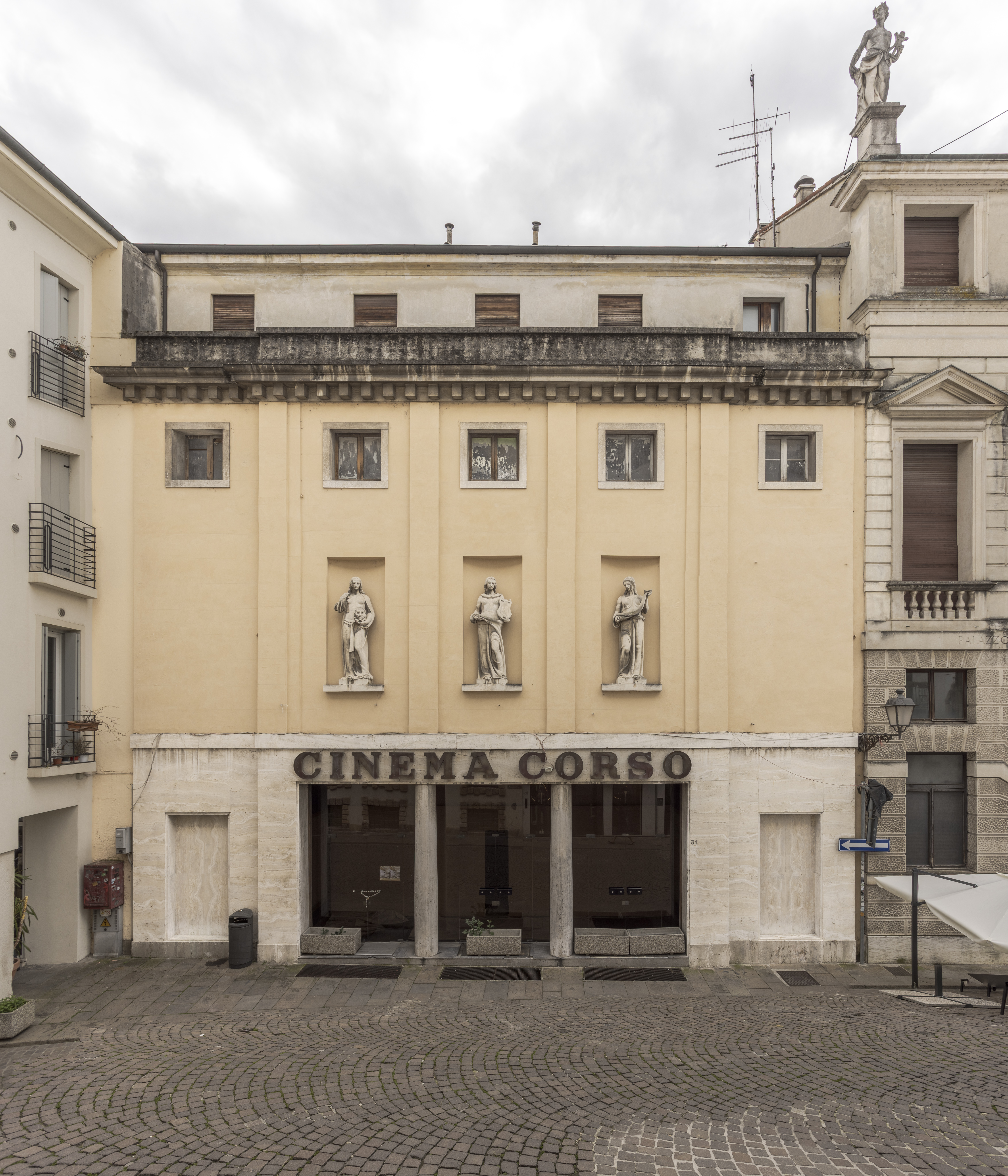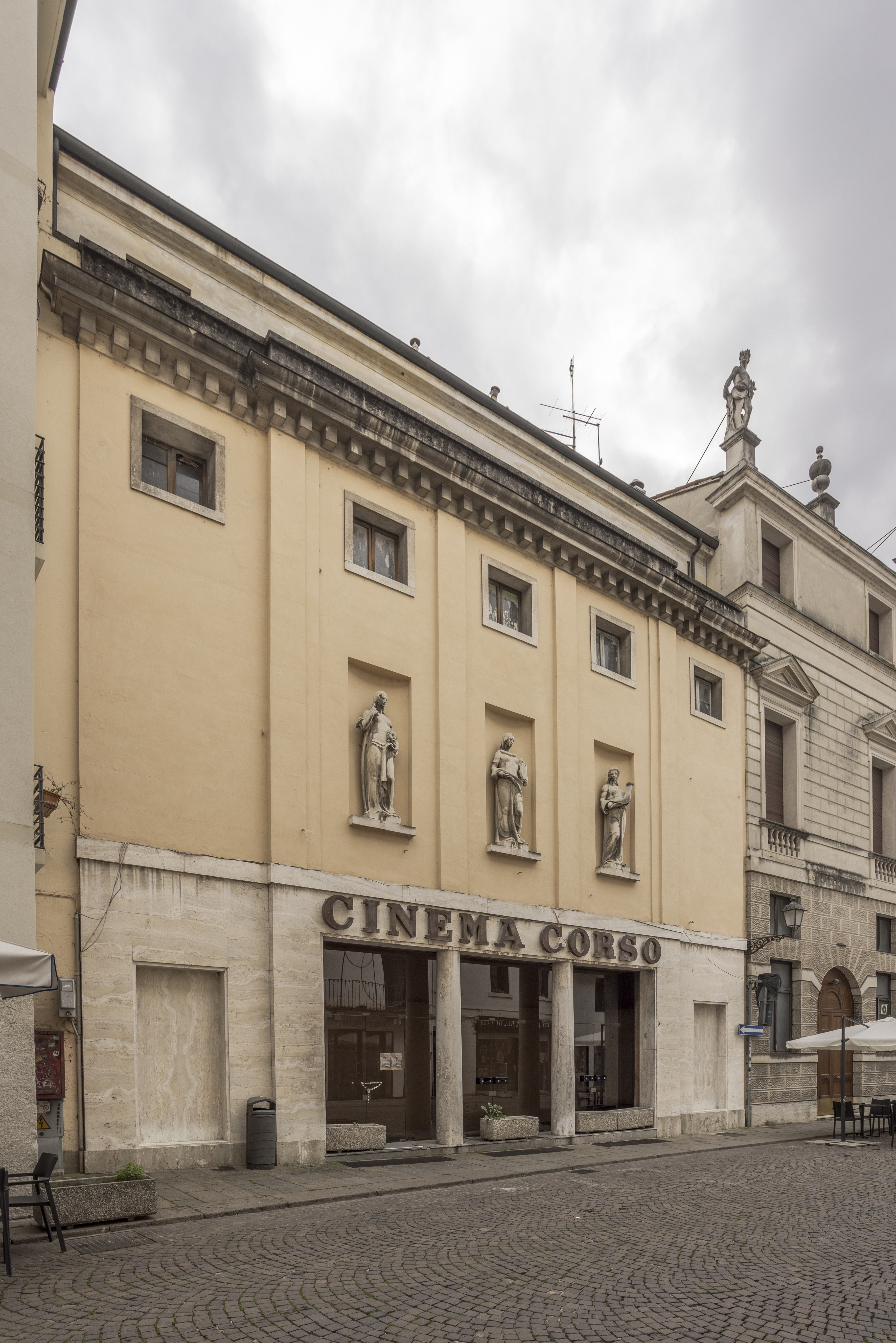 Inaugurato il 21 febbraio 1948 con I miserabili di Riccardo Freda, il Cinema Corso fu progettato dall’architetto Giuseppe Morseletto e si distingueva dalle altre sale cittadine per la sua forma leggermente trapezoidale e per la facciata su Corso Fogazzaro decorata da tre sculture raffiguranti le muse dell’arte, realizzate dal Laboratorio Morseletto. Con i suoi 600 posti a sedere e il soffitto apribile — soluzione che garantiva un ambiente fresco anche nei mesi estivi — il Corso era considerato uno dei cinema più eleganti e prestigiosi della città, punto di riferimento per la programmazione internazionale, con una particolare attenzione al cinema americano.