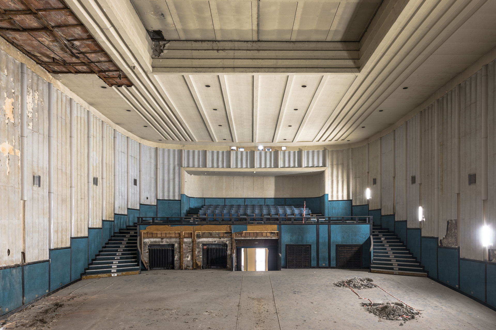 La storica sala trapezoidale diventa il fulcro di un sistema modulare, capace di adattarsi a configurazioni differenti: platea, spazio performativo, ambiente espositivo, sala immersiva. L’intervento prevede un aggiornamento strutturale e impiantistico integrato, con infrastrutture tecnologiche avanzate e soluzioni orientate all’efficienza energetica e al riuso consapevole dell’esistente, in un’ottica di sostenibilità ambientale oltre che gestionale.