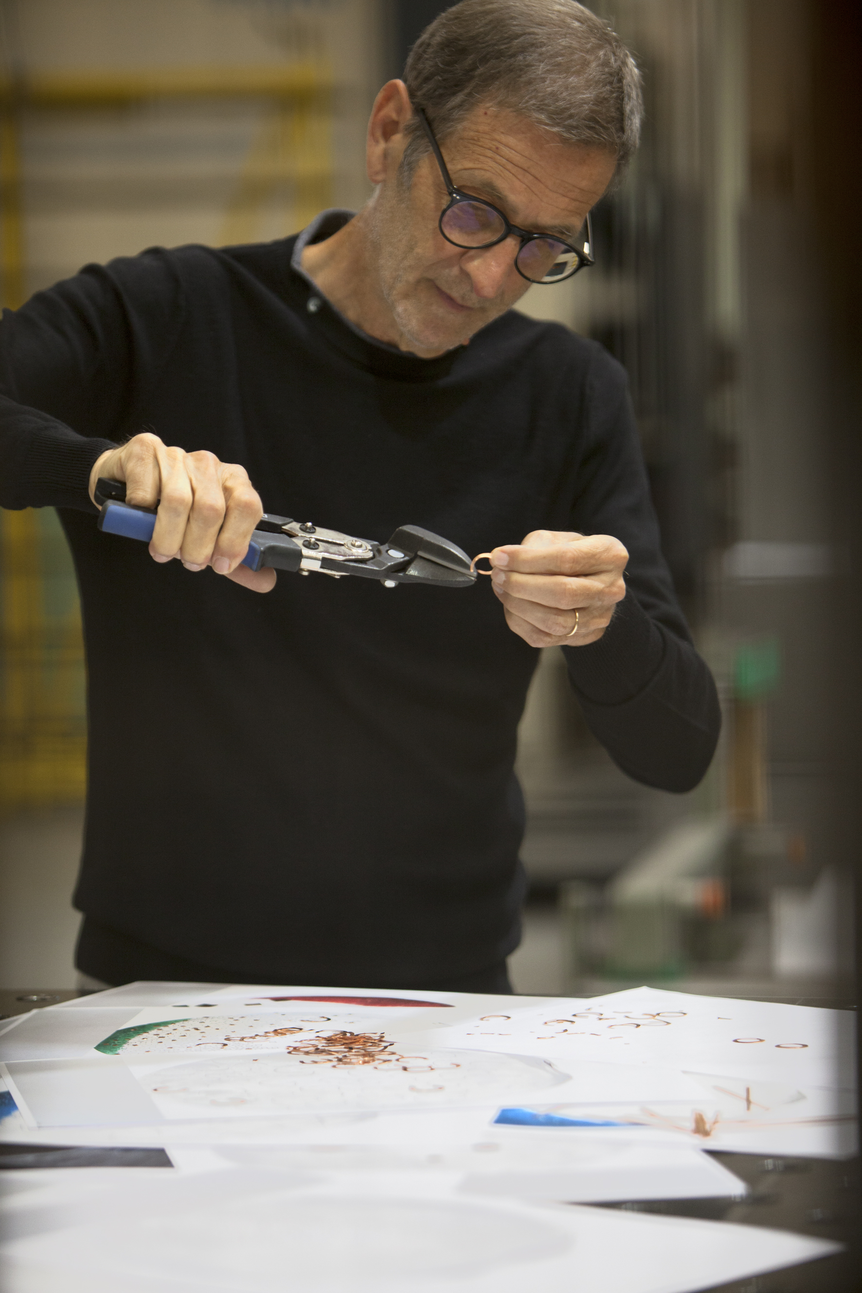 Con l’uso di un materiale nobile come il rame crudo, proveniente da scarti di lavorazione industriale (recuperato in Telwin spa, industria del vicentino), e il vetro soffiato a bocca secondo la tradizione muranese, il designer, affronta, in questa esperienza, la volontà di completare l’idea iniziale di progetto e sperimentazione fra artigianalità e industria in un cammino di studio fra sintesi, sperimentalismo funzionale, recupero e dettaglio costruttivo nelle diverse componenti tecnico costruttive.
