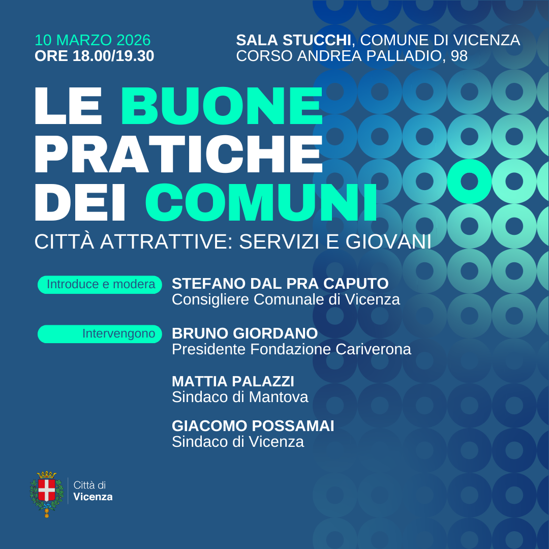 Interverranno Giacomo Possamai, sindaco del Comune di Vicenza, Mattia Palazzi, sindaco del Comune di Mantova, e Bruno Giordano, presidente della Fondazione Cariverona. L’incontro sarà introdotto e moderato dal consigliere comunale delegato alle buone pratiche, Stefano Dal Pra Caputo.