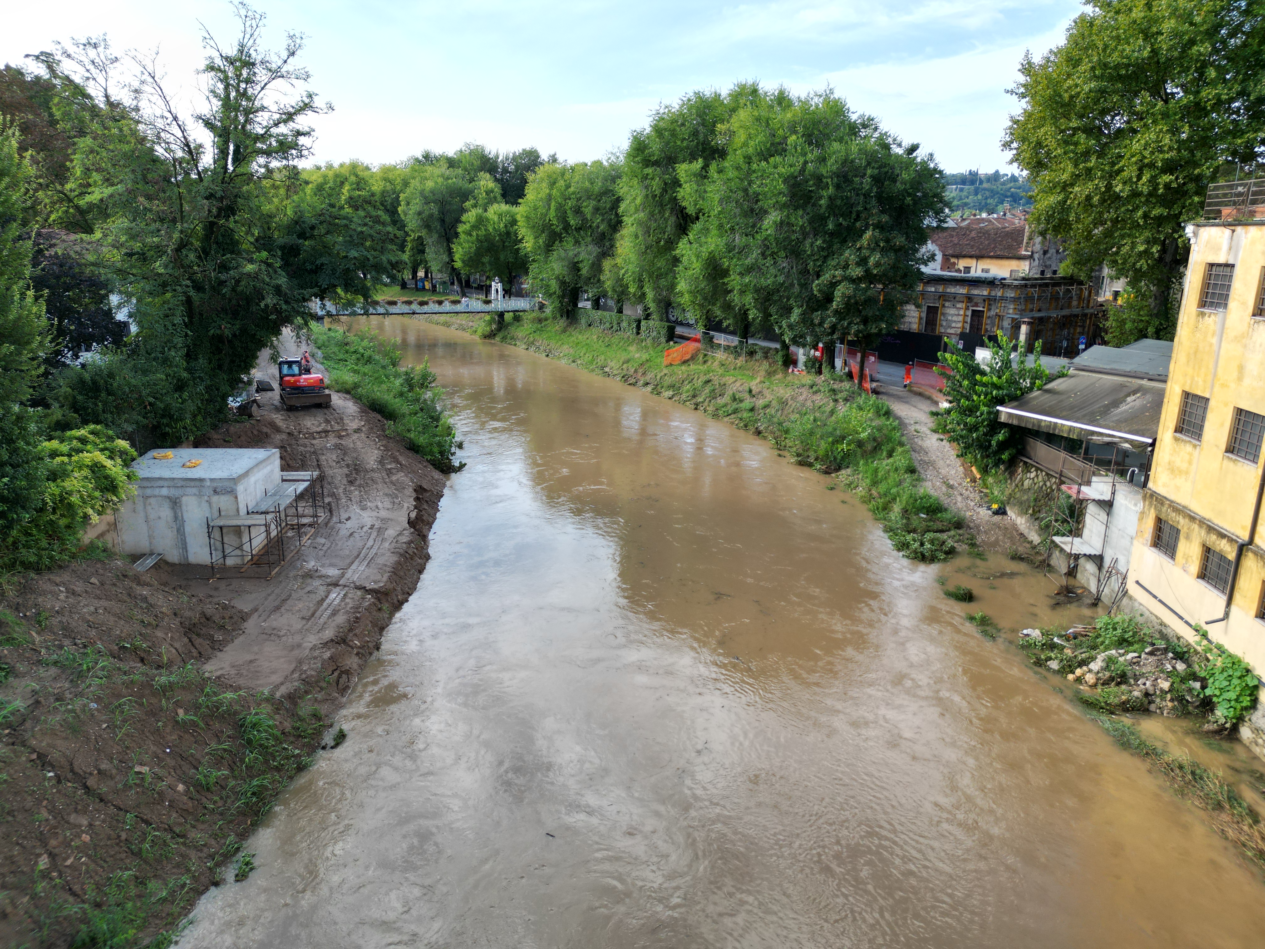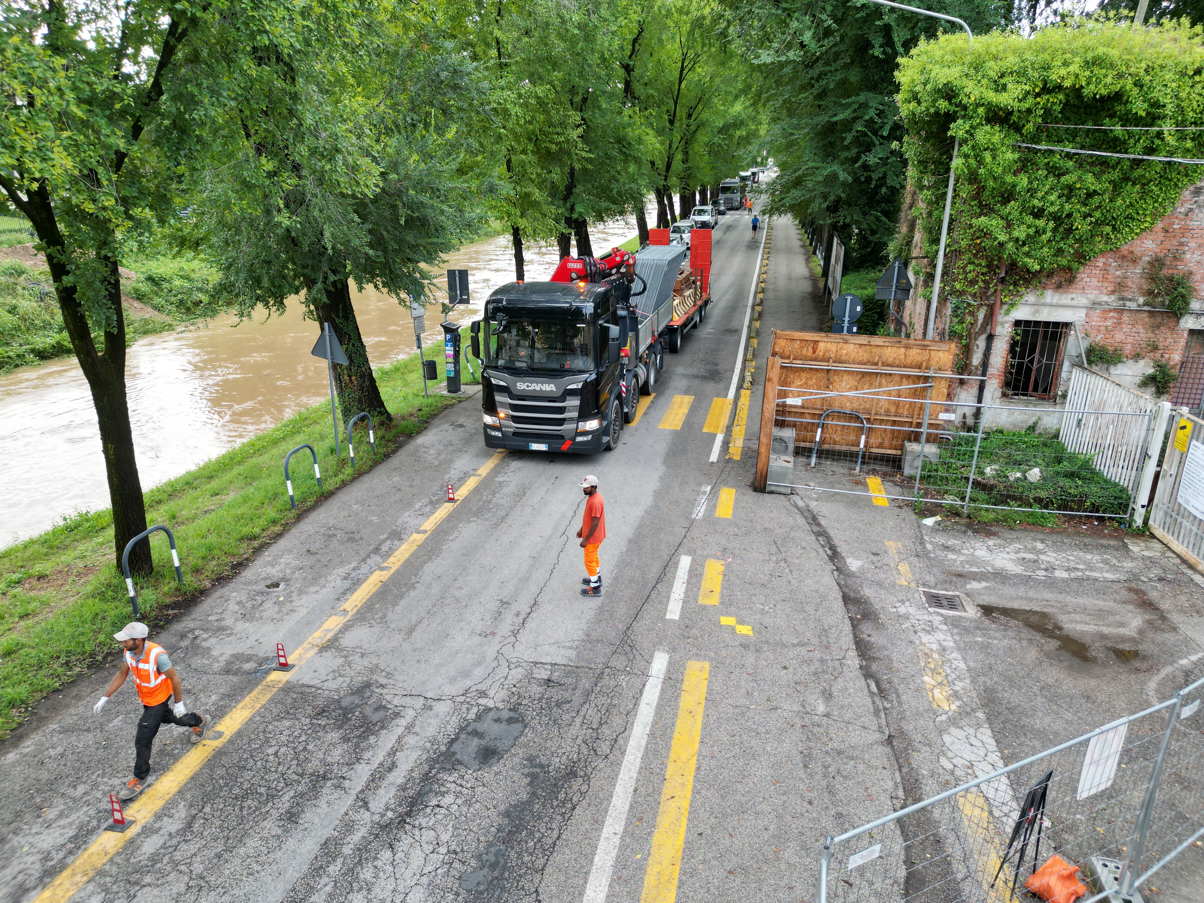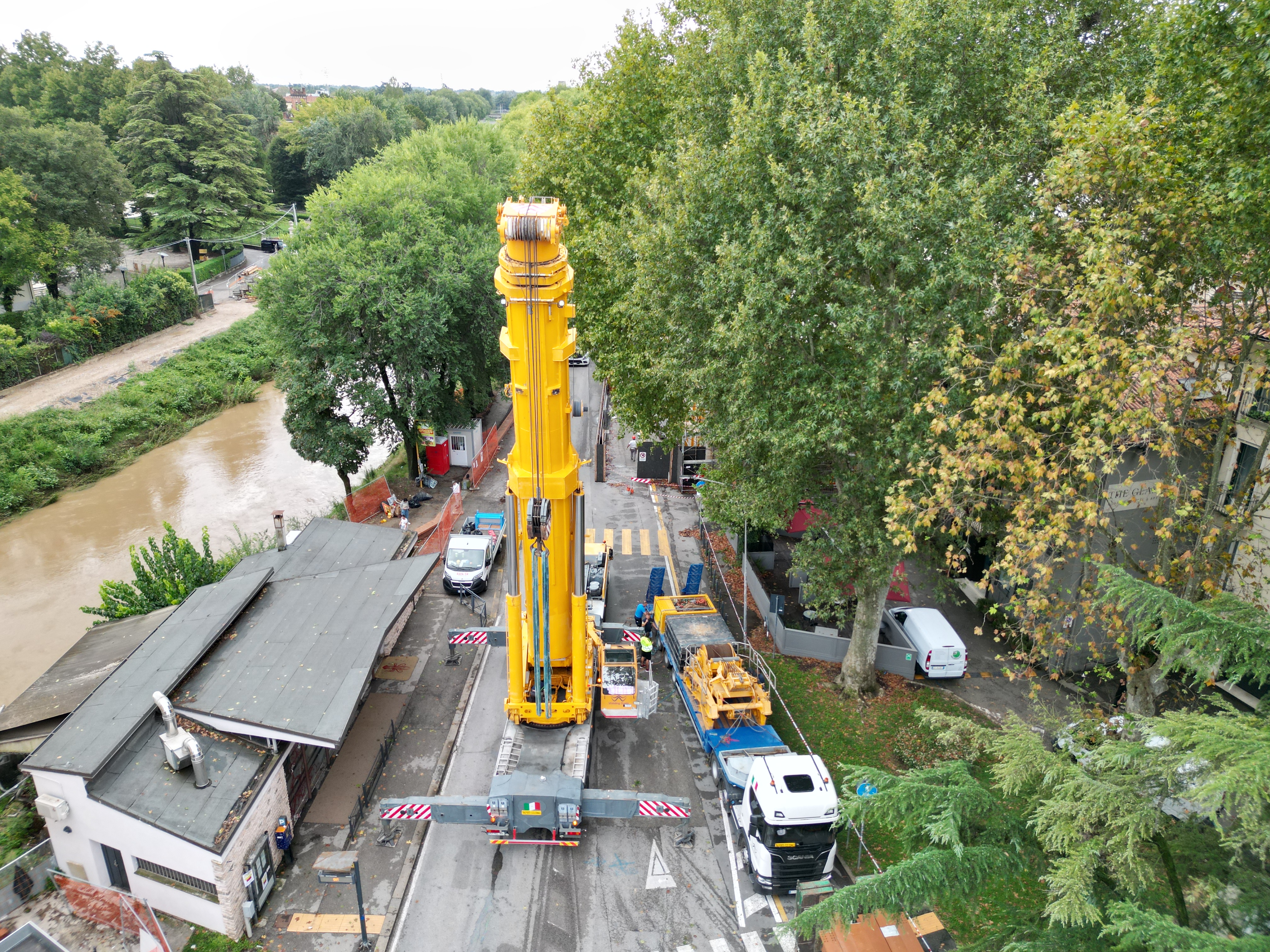 Questa mattina sono giunti in cantiere i mezzi d'opera e le travi che, assemblate, andranno a costituire la nuova passerella ciclopedonale sul fiume Bacchiglione.