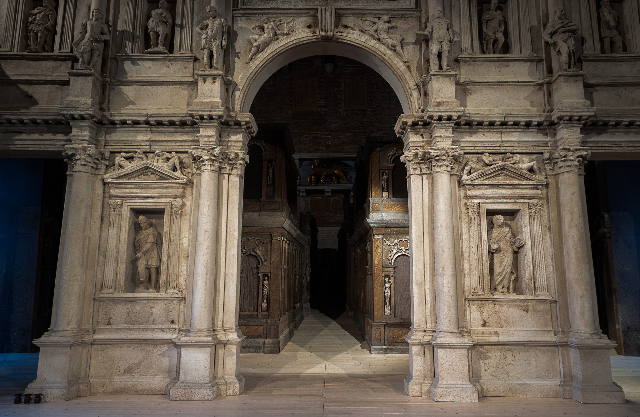 Il Teatro Olimpico, teatro coperto più antico al mondo, ultima opera di Andrea Palladio, in dialogo con la Basilica Palladiana, prima opera del grande architetto rinascimentale.
