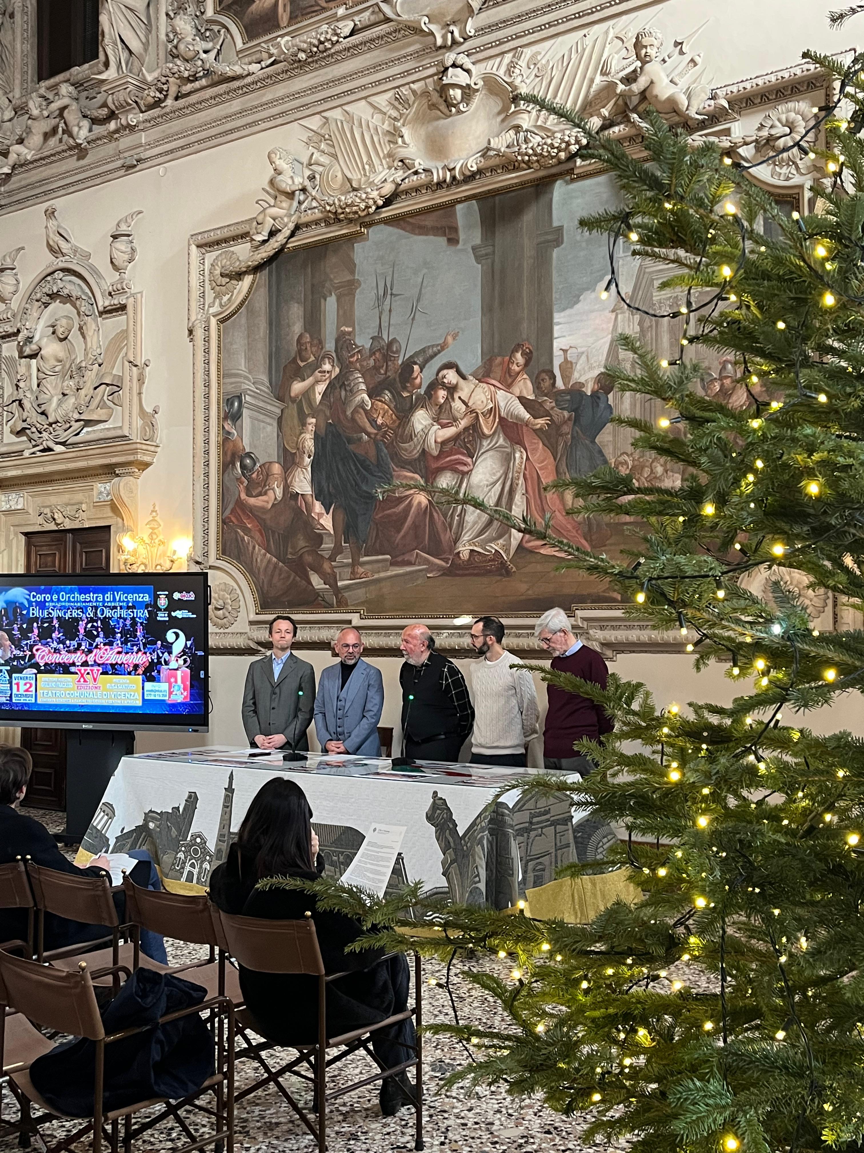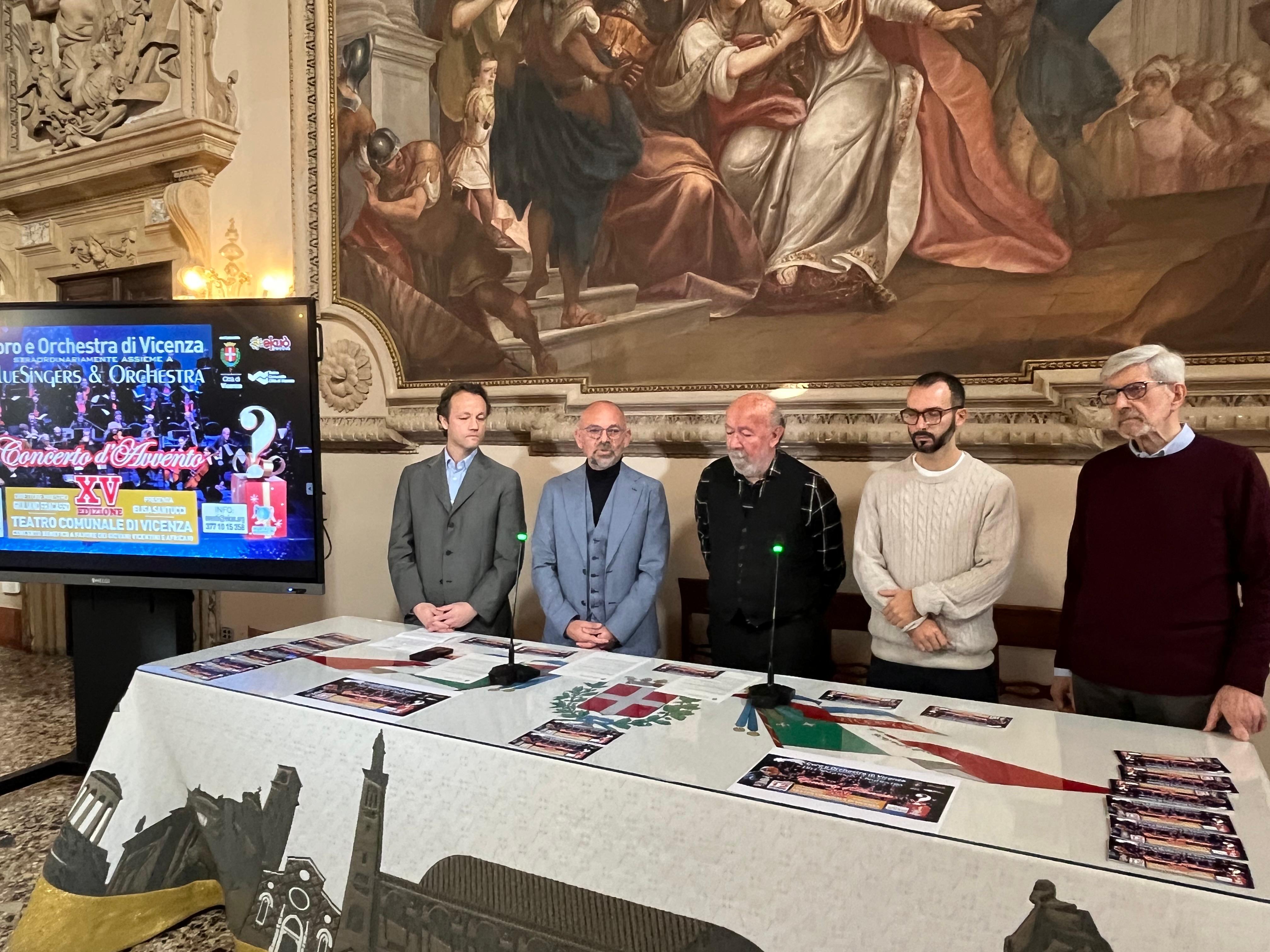 Questa mattina la quindicesima edizione del tradizionale concerto benefico natalizio è stata presentata da Matteo Tosetto, assessore alle politiche sociali, Alessandro Pellizzari, direttore di Murialdo World ets, Giuliano Fracasso, maestro e direttore del Coro e Orchestra di Vicenza, Enrico Brunelli, direttore della BlueSingers & Orchestra di cui ha preso le redini dal padre Diego, scomparso ad ottobre quando già stava preparando questo concerto, e Alberto Strobbe, presidente della BlueSingers & Orchestra.