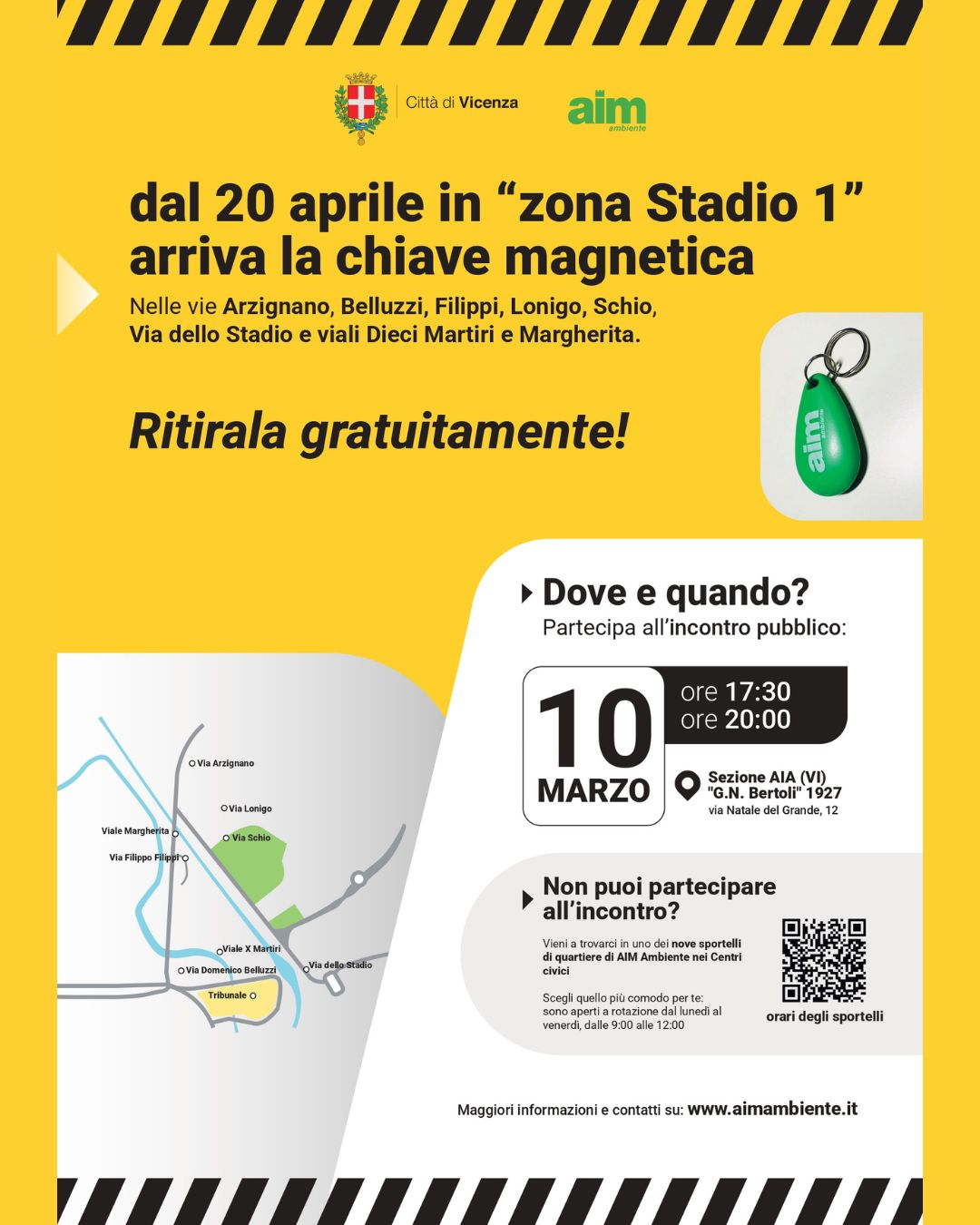 Per consegnare le chiavi magnetiche e per illustrare alla cittadinanza il corretto utilizzo dei nuovi cassonetti, Comune e Aim Ambiente hanno organizzato alcuni incontri pubblici che si terranno, per la “zona Stadio 1, ovvero i residenti nelle vie Arzignano, Belluzzi, Filippi, Lonigo, Schio, via dello Stadio e viali Dieci Martiri e Margherita, martedì 10 marzo alle 17.30 e alle 20 presso la sezione Aia “G.N. Bertoli 1927”, in via Natale del Grande 12. I cittadini che parteciperanno sono invitati a portare il codice fiscale dell’intestatario dell’utenza Tari e, possibilmente, anche l’ultima bolletta Tari. Chi sarà impossibilitato a ritirare la chiave magnetica nell’incontro del 10 marzo, potrà recarsi in uno dei nove sportelli di quartiere dei centri civici, a sua scelta, aperti a rotazione dalle 9 alle 12, dal lunedì al venerdì.