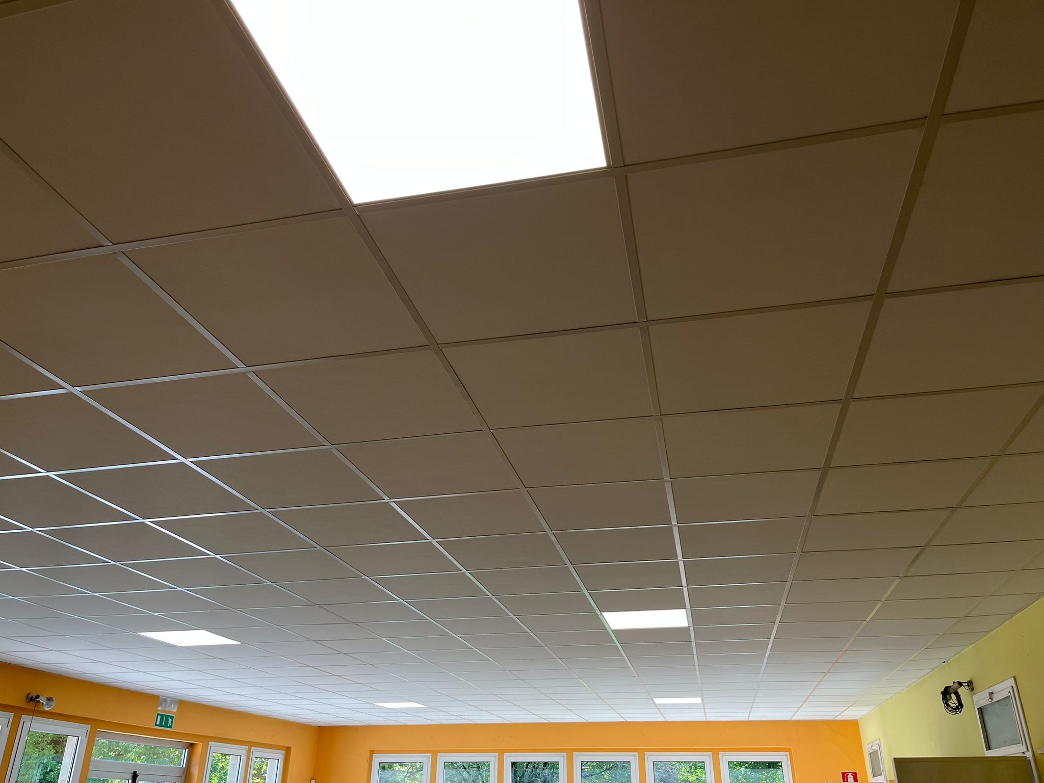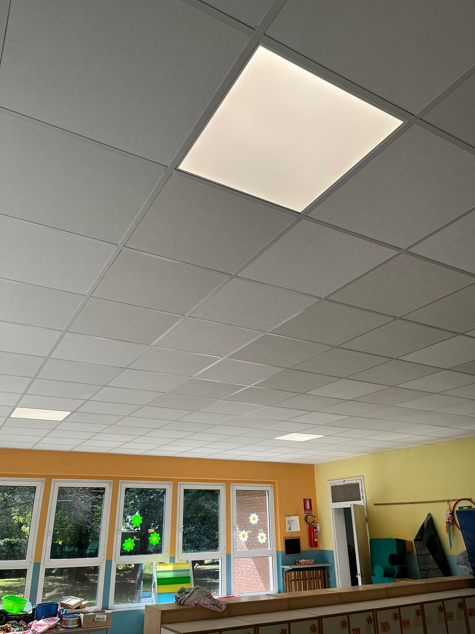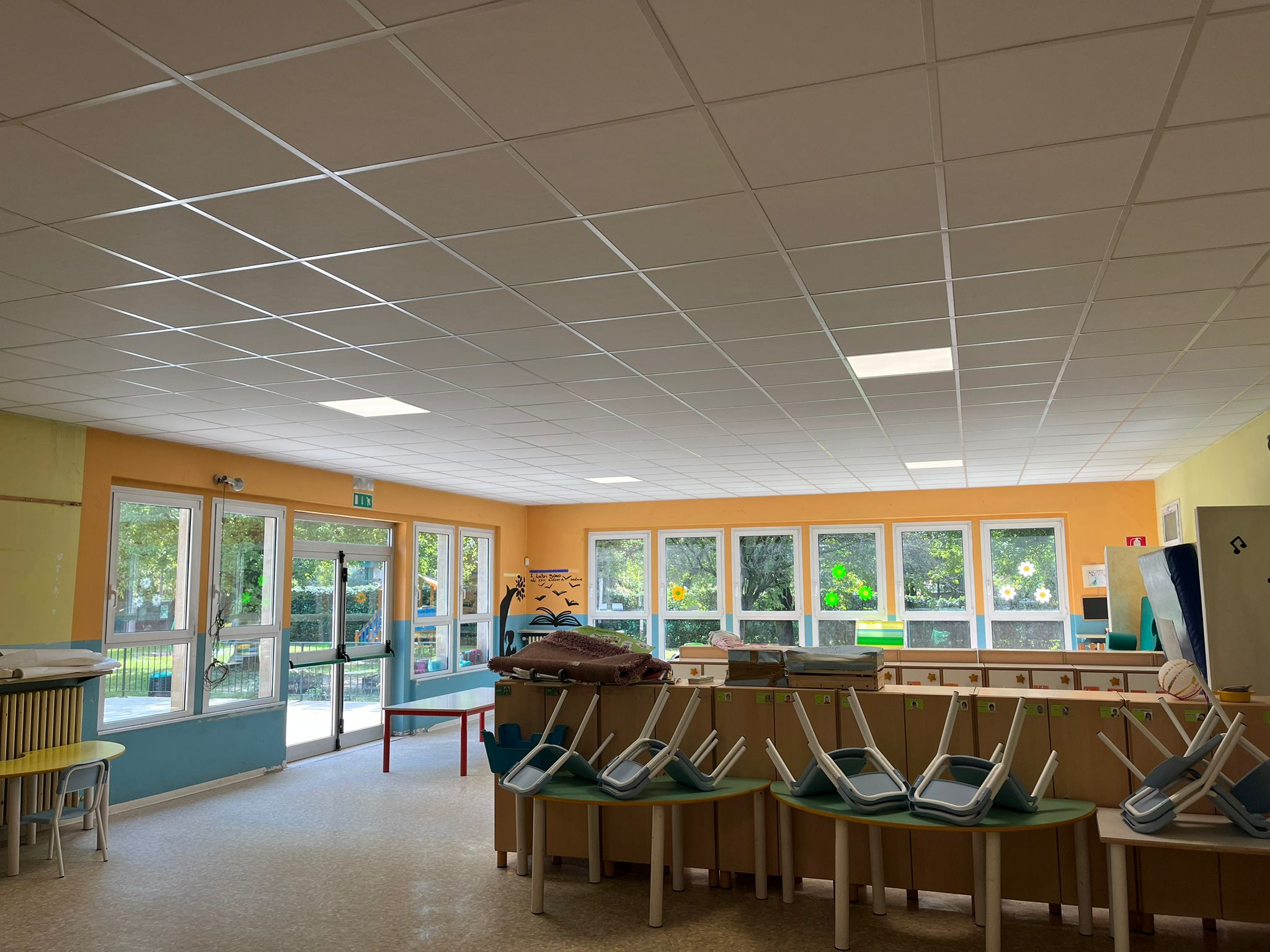 Un intervento che ha interessato una superficie di circa 800 metri quadrati, sviluppata su due livelli, e che prevede la sostituzione di 75 punti luce esistenti, posizionati nei vari locali all’interno dell’edificio, con l’installazione di nuovi corpi illuminanti a led. Il lavoro ha visto anche la realizzazione di nuovi controsoffitti in pannelli di lana di roccia: di questi, nei locali palestrina, refettorio e salone, in sostituzione degli esistenti in doghe metalliche, e uno completamente nuovo nel locale dormitorio.