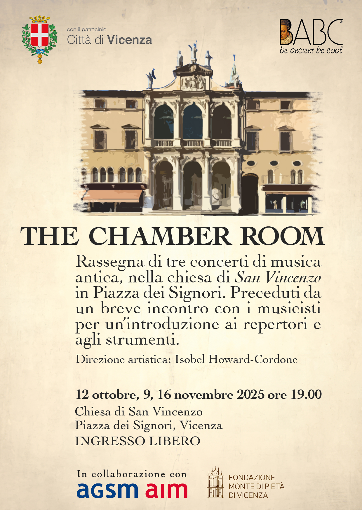 La seconda edizione della rassegna di musica antica The chamber room propone tre concerti di musica antica nella Chiesa di San Vincenzo, in piazza dei Signori, il 12 ottobre, 9 e 16 novembre con protagonisti giovani musicisti di altissimo livello artistico. La rassegna, organizzata dall’associazione culturale Be Ancient Be Cool, è realizzata con il patrocinio del Comune di Vicenza e il sostegno di Agsm Aim e dellla Fondazione Monte di Pietà di Vicenza.