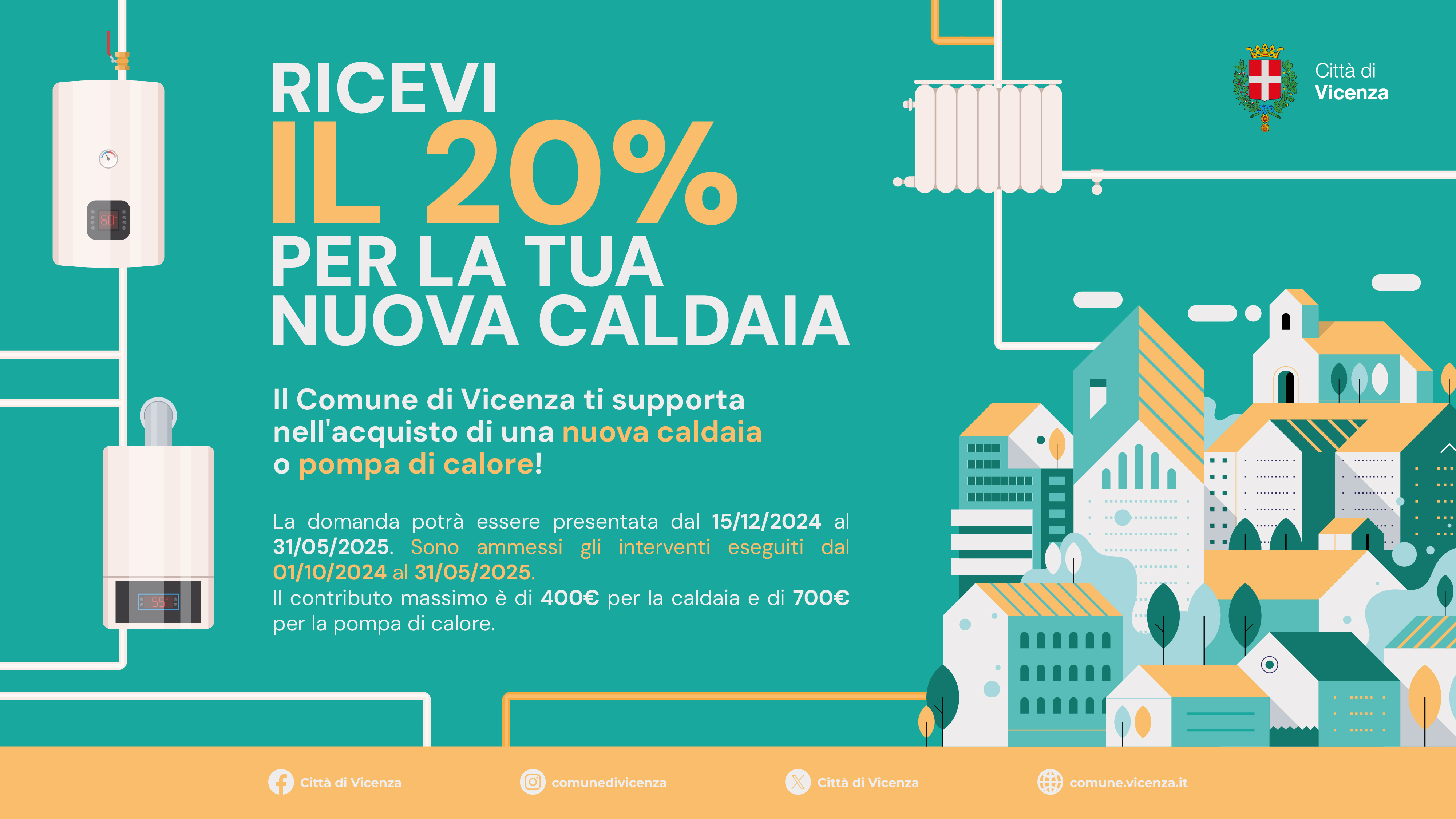 Il bando riguarda l’erogazione di contributi per l’acquisto di caldaie a condensazione in classe A o superiore e di pompe di calore. Nel dettaglio, il beneficio sarà pari al 20% della spesa sostenuta per un massimo di 400 euro per l’acquisto di una caldaia a condensazione e di 700 euro per la pompa di calore. Sarà possibile richiedere il contributo tramite il sito del Comune di Vicenza a partire dal 15 dicembre 2024 e fino al 31 maggio 2025.