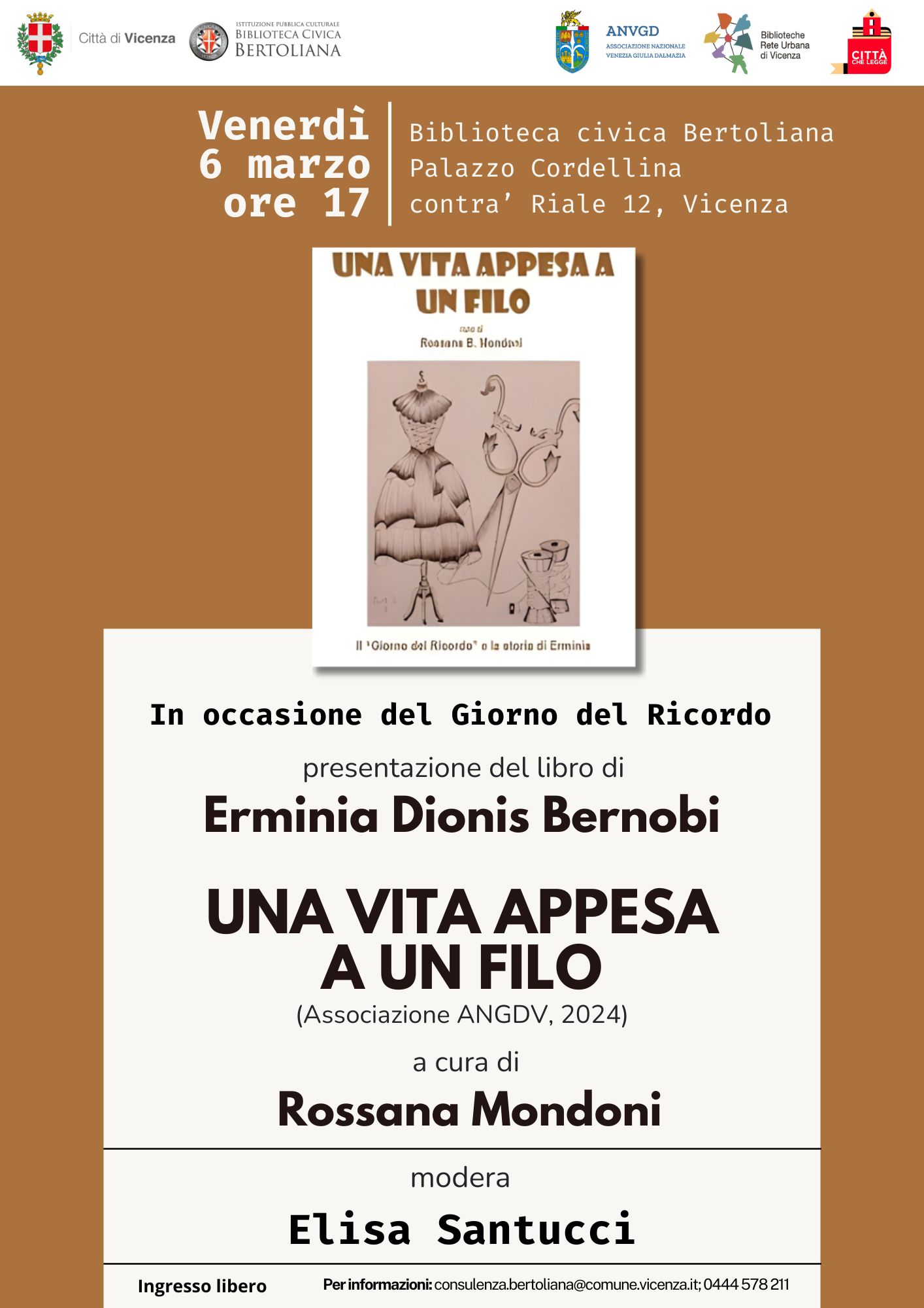 Nell'ambito del calendario di eventi per il Giorno del Ricordo 2026, promosso dal Comune di Vicenza in collaborazione con la Biblioteca civica Bertoliana e l'Associazione nazionale Venezia Giulia e Dalmazia (Anvgd), venerdì 6 marzo alle 17 a Palazzo Cordellina (contra' Riale 12) si terrà la presentazione del libro "Una vita appesa a un filo", curato da Rossana Mondoni, alla presenza dell'autrice, la 94enne Erminia Dionis Bernobi (ingresso libero fino ad esaurimento dei posti).