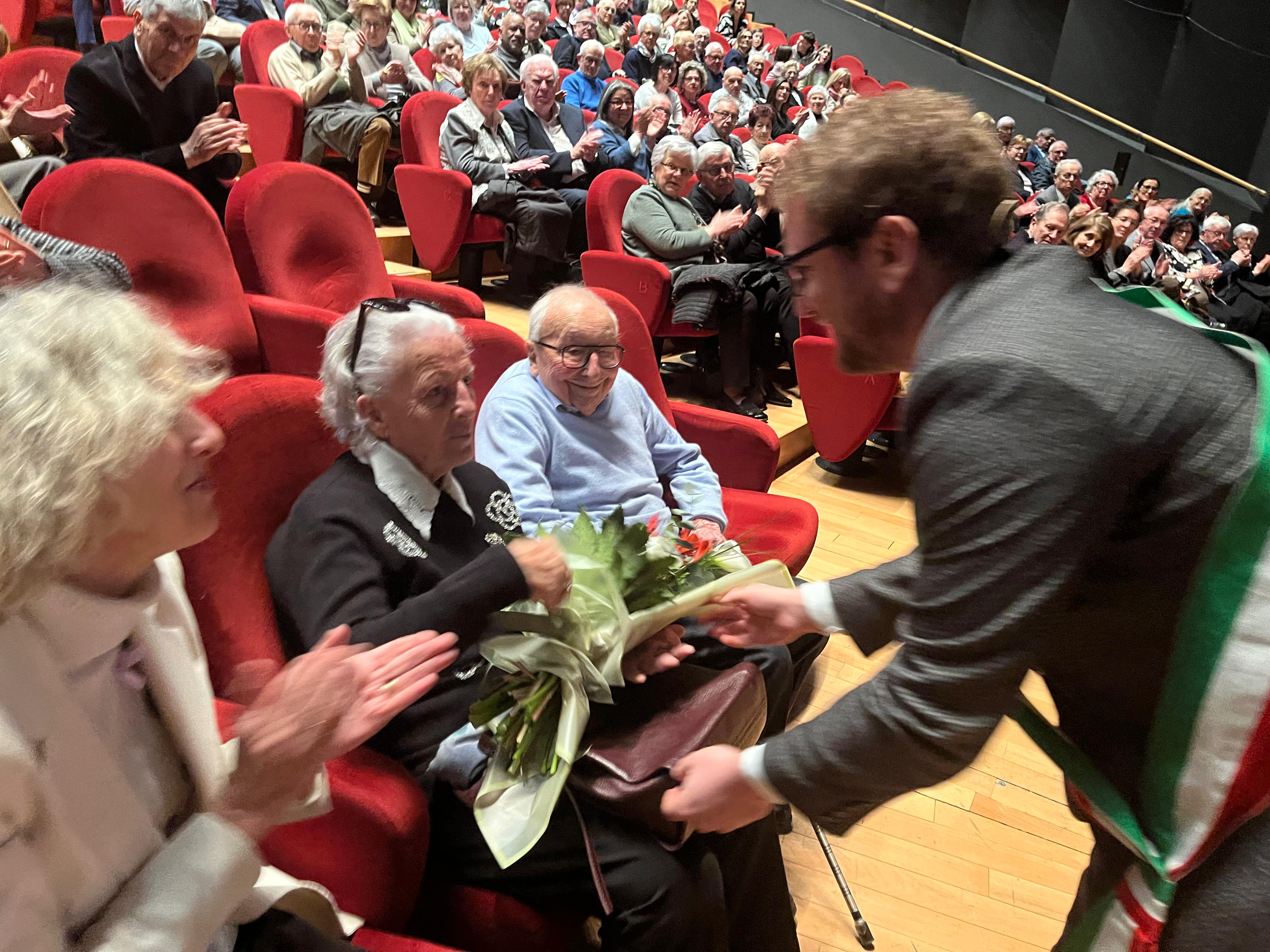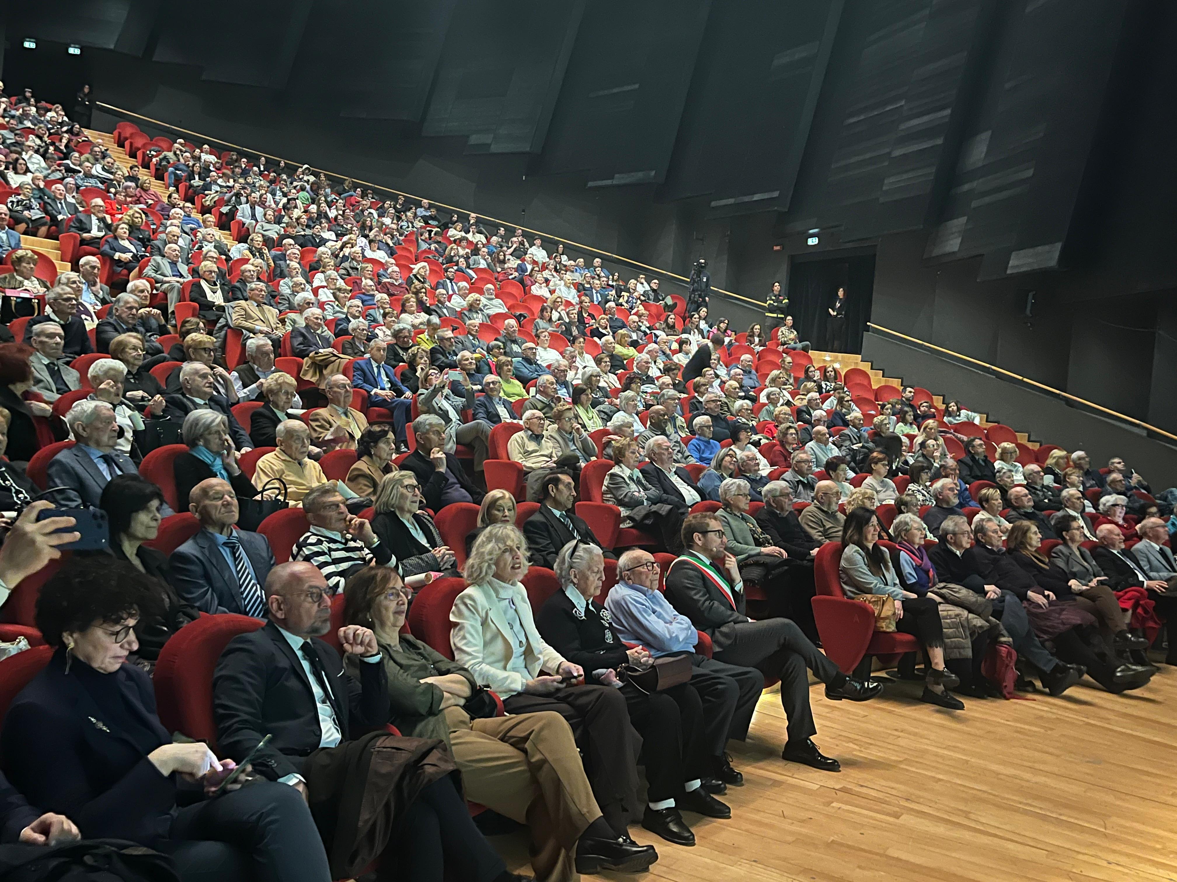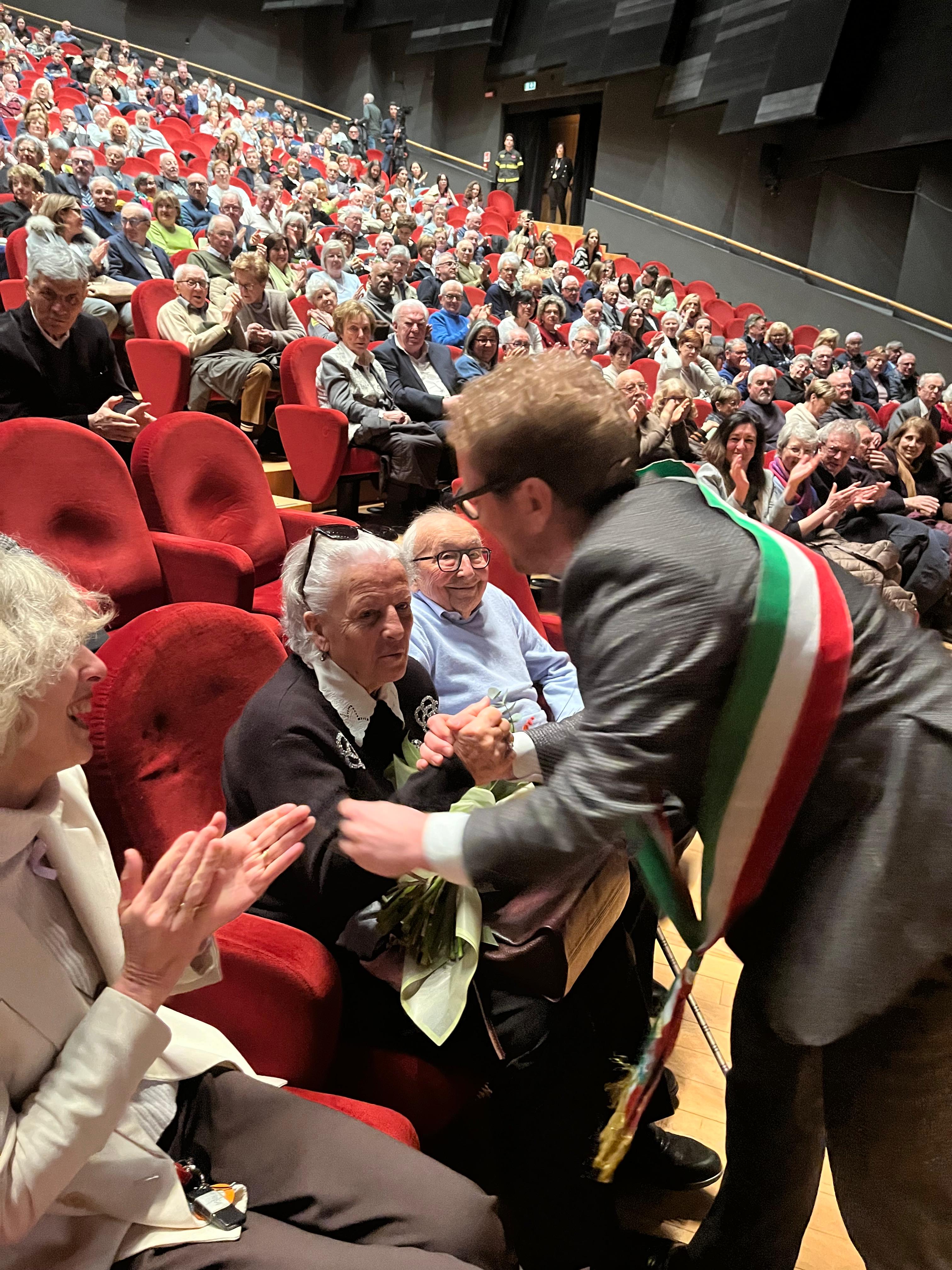 «Quando vi guardo – ha detto Giorgio Sala al pubblico - mi sento di dirvi bravi perché avete resistito nel matrimonio. Siete fantastici, resistenti. Il matrimonio è una cosa molto impegnativa, figuriamoci se dura per 50, 60, 70 anni. Servono davvero forza, coraggio, pazienza». E dopo aver testimoniato la complessità, ma anche la sacralità, di una vita vissuta insieme, ha concluso: «Qui oggi centinaia di cuori stanno battendo insieme e insieme fanno il grande cuore della nostra città».