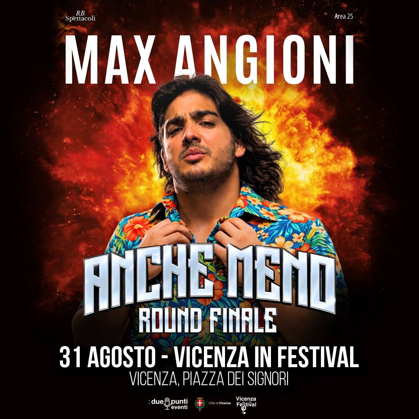 Un tocco di comicità nella nuova edizione di Vicenza in Festival. Max Angioni sarà in Piazza dei Signori il 31 agosto (ore 21) arricchendo il cartellone, firmato da DuePunti Eventi in collaborazione con il Comune di Vicenza e Confcommercio Vicenza, che ospita anche Arisa (29 agosto), Noemi (30 agosto), Raf (1 settembre), Madame (2 settembre) ed Elio e le Storie Tese (3 settembre).